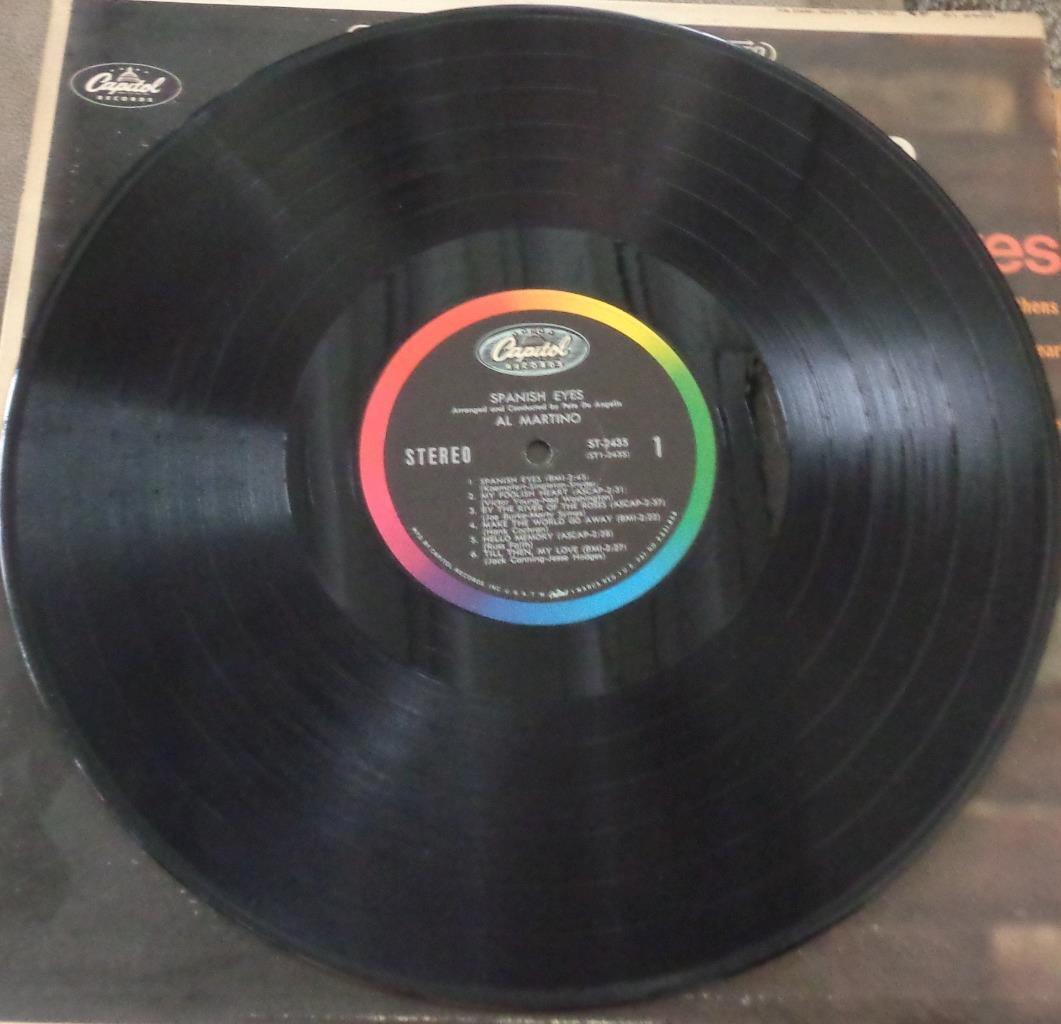 Offered here is this nice vintage full length LP Vinyl Record, Al Martino, Spanish Eyes. The record is a Capitol record and plays at 33.3 speed. It is in good condition but does have some light scratches on it. I do not own a record player, so the record has not been tested. It is a 12? vinyl record. It would be a wonderful addition to any vintage vinyl collection. It features the songs;
