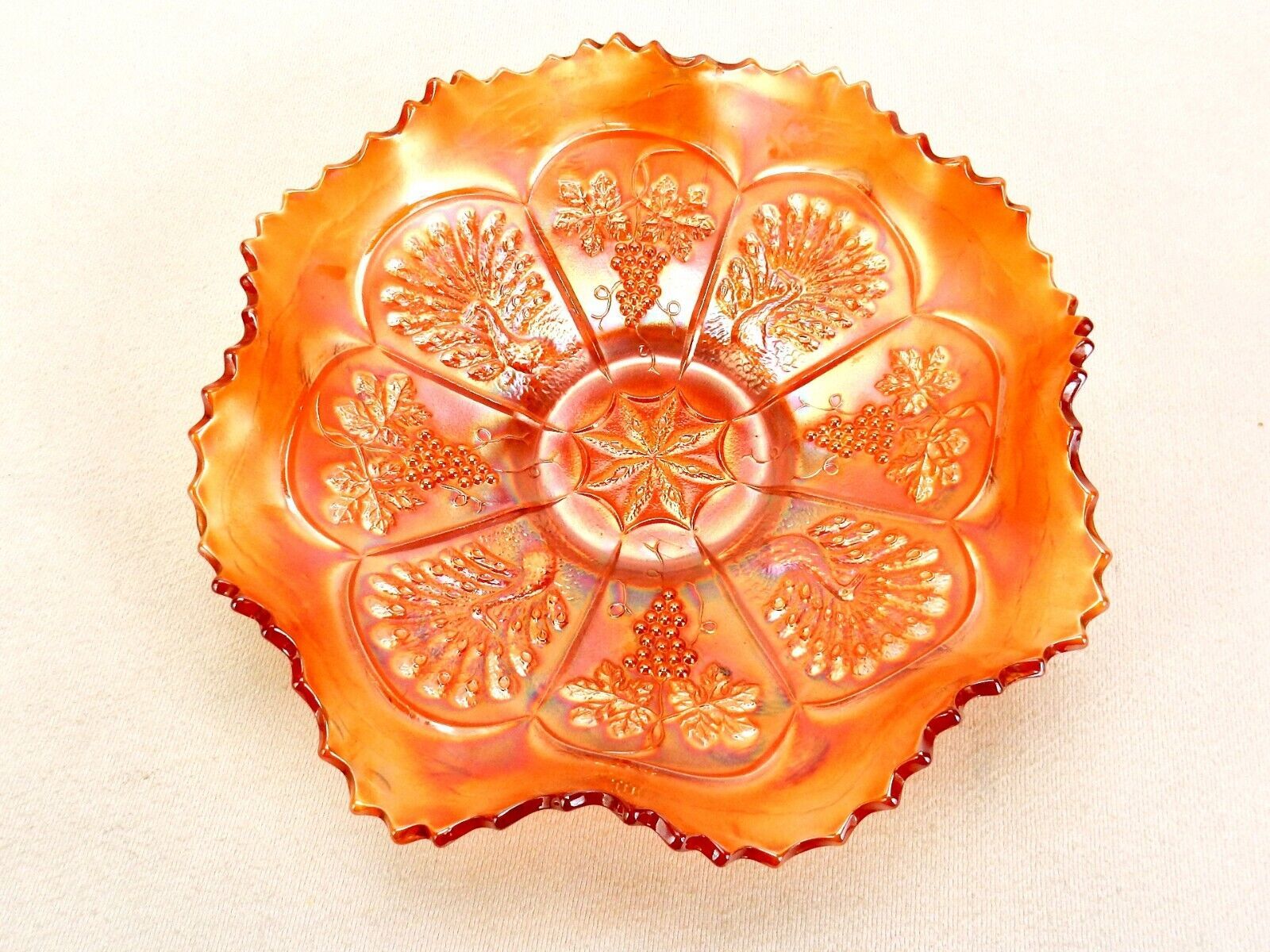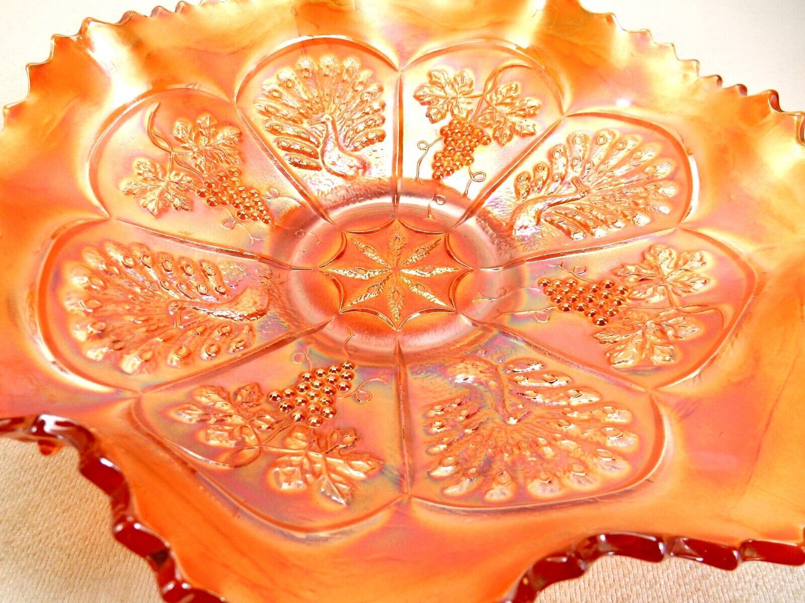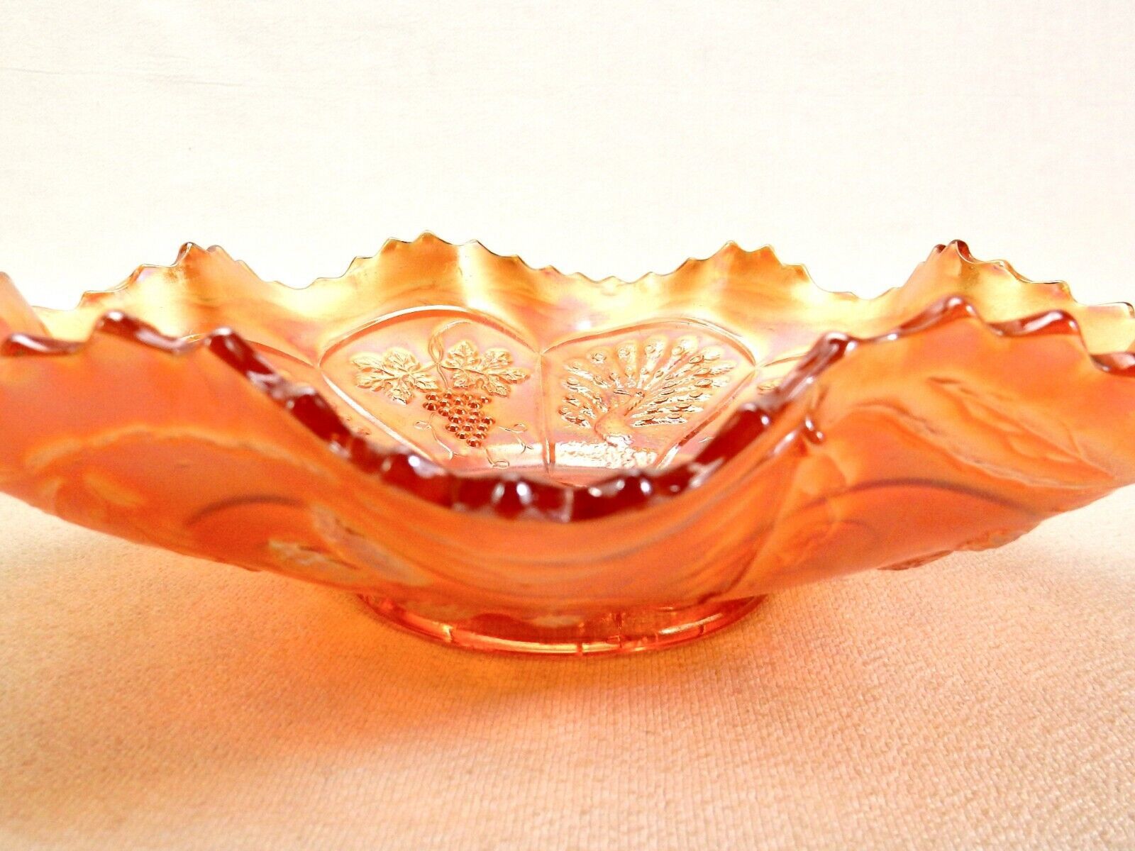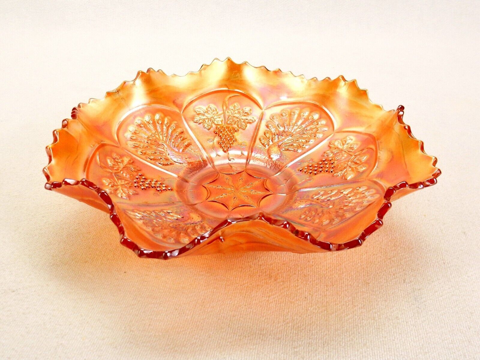 Fenton Marigold Carnival Glass Bowl, Peacocks And Grapes, Ruffled Sawtooth Rim