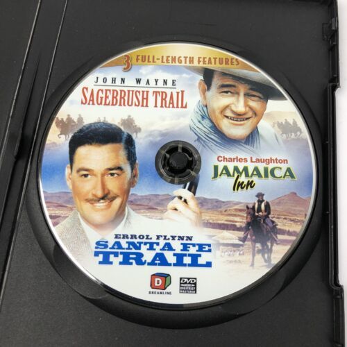 3 Full Length Features DVD * Sagebrush Trail * Santa Fe Trail * Jamaica Inn John Wayne Errol Flynn Ronald Reagan Charles Laughton Very Good Condition