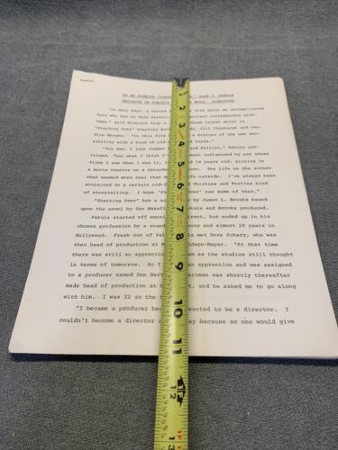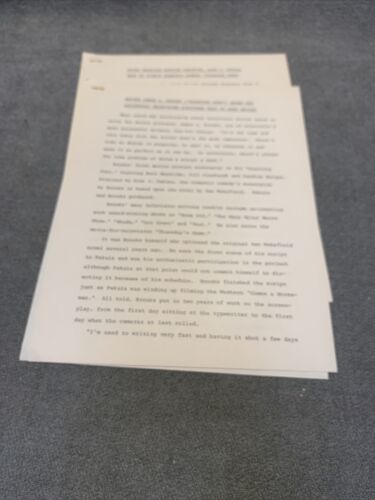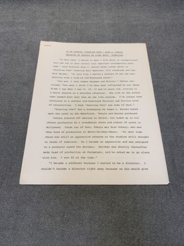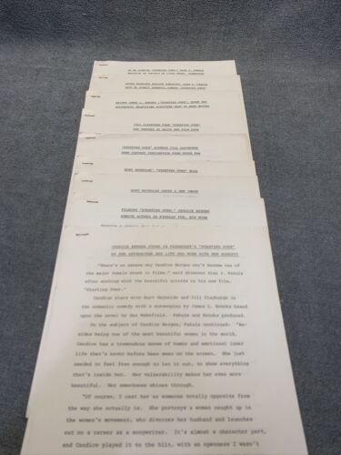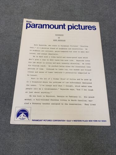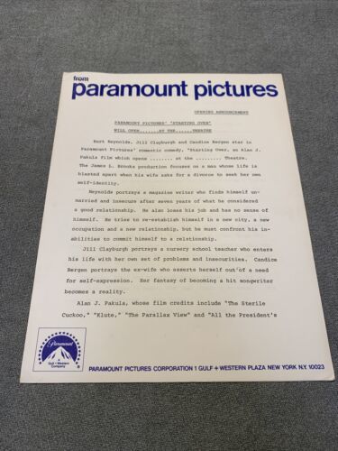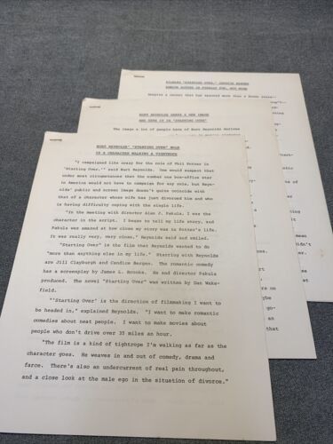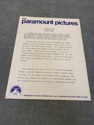 Lot includes press releases for the movie ?Starting Over? starring Burt Reynolds and Candace Bergman. Also includes the Handbook of movie production information and a bio of Burt Reynolds. Some items on official Paramount stationary.