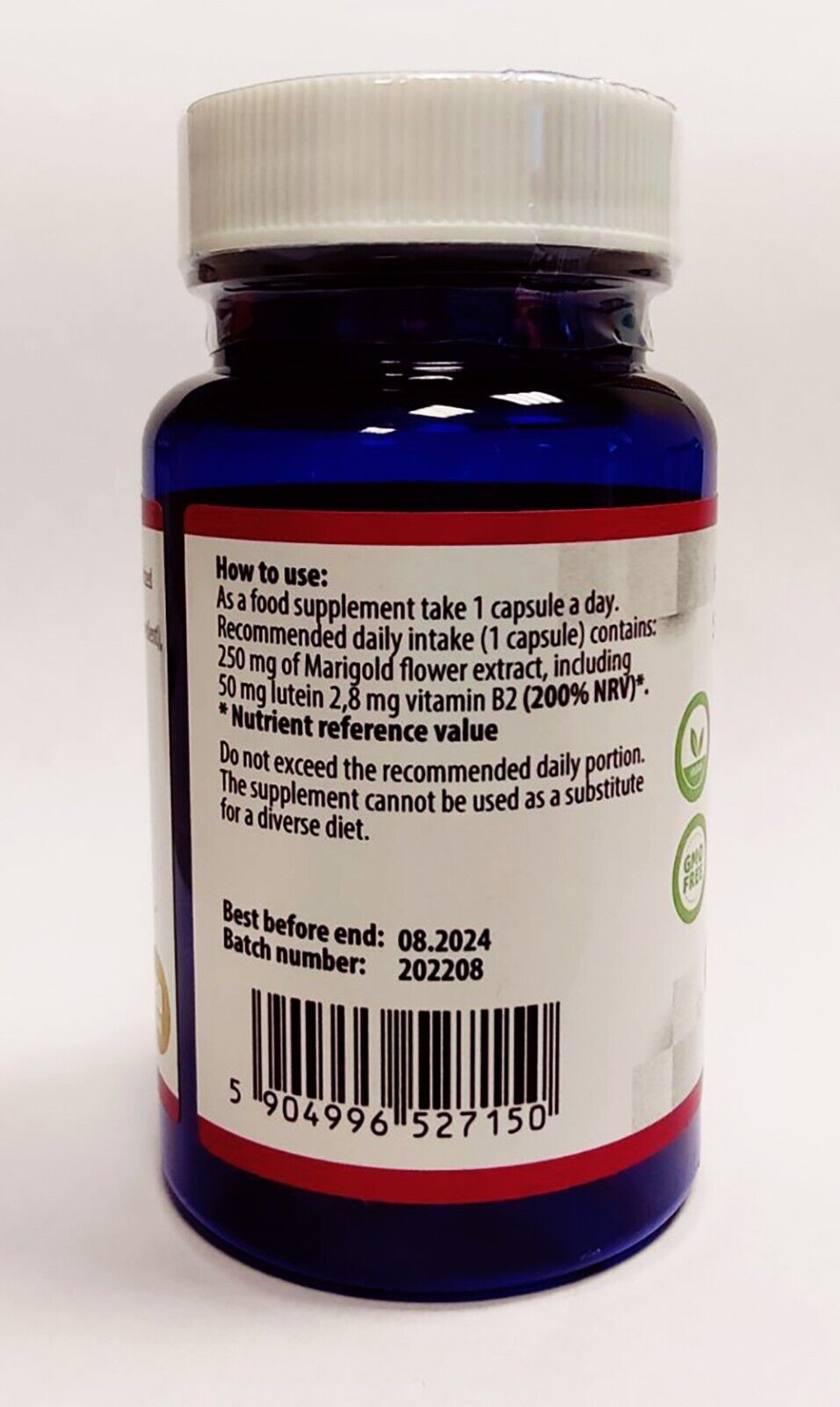 Ingredients: Marigold Extract Vegan Capsules Providing Lutein 50mg , 2,8mg vitamin B2 (200%NRV)