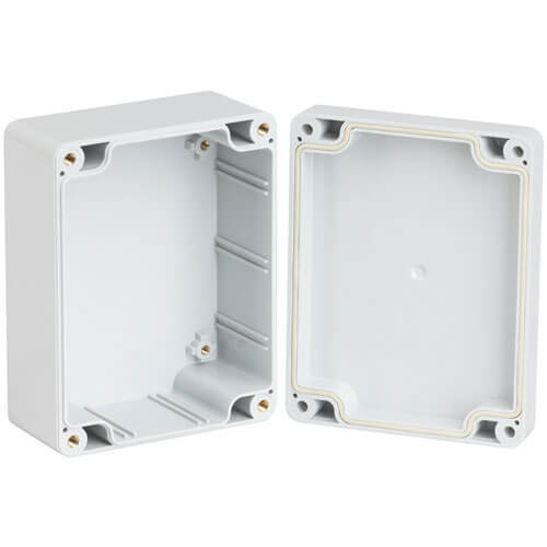 Made with Polycarbonate material and moulded in light grey. Operating temperature : minus 40C to 125C The lid and base incorporate a toungue and groove sealing system with a EPDM gasket Lid fixing screws are M-4 stainless steel (non metallic) into threaded brass inserts Wall mounting holes and lid fixing screws are outside the sealing area thus preventing the ingress of moisture dust Designed to IP65 of IEC 529and NEMA 4 (dust and hoseproof) Internal guide slots for mounting PCB assemblies vertically Dimensions 115x90x55mm