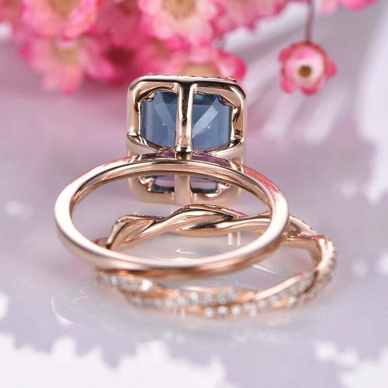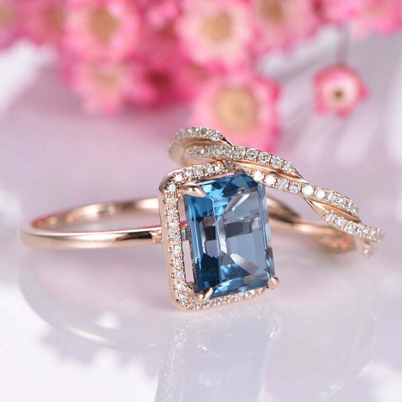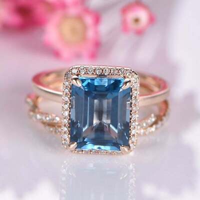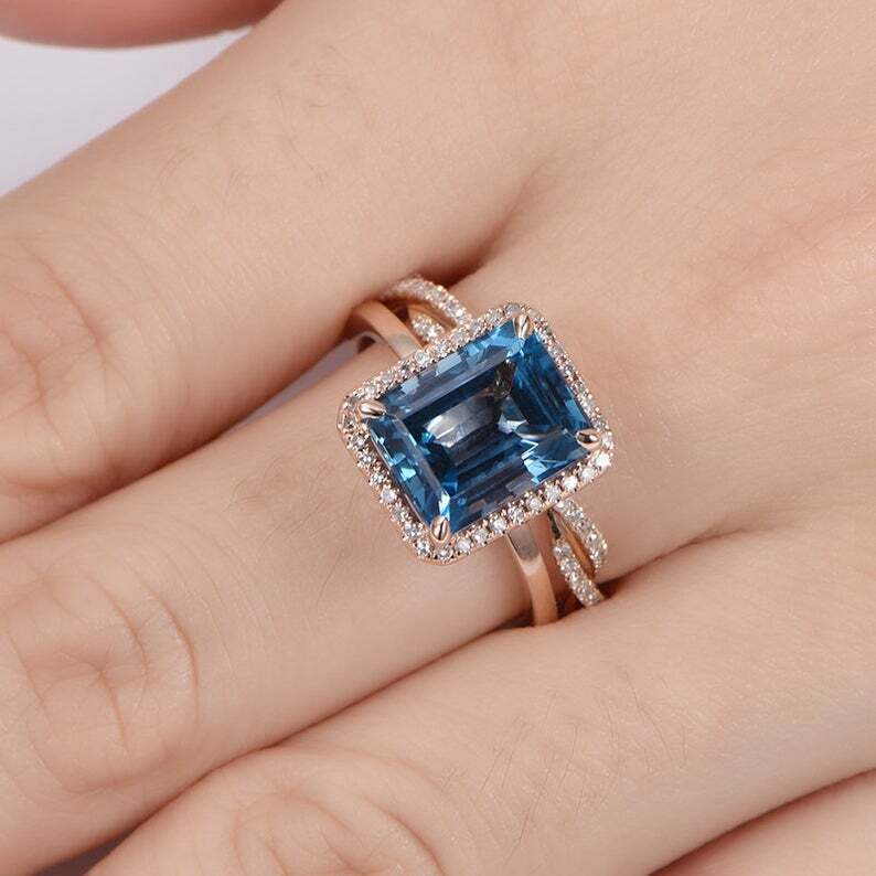 Bague de fiançailles nuptiale avec topaze bleue de Londres taille émeraude...
