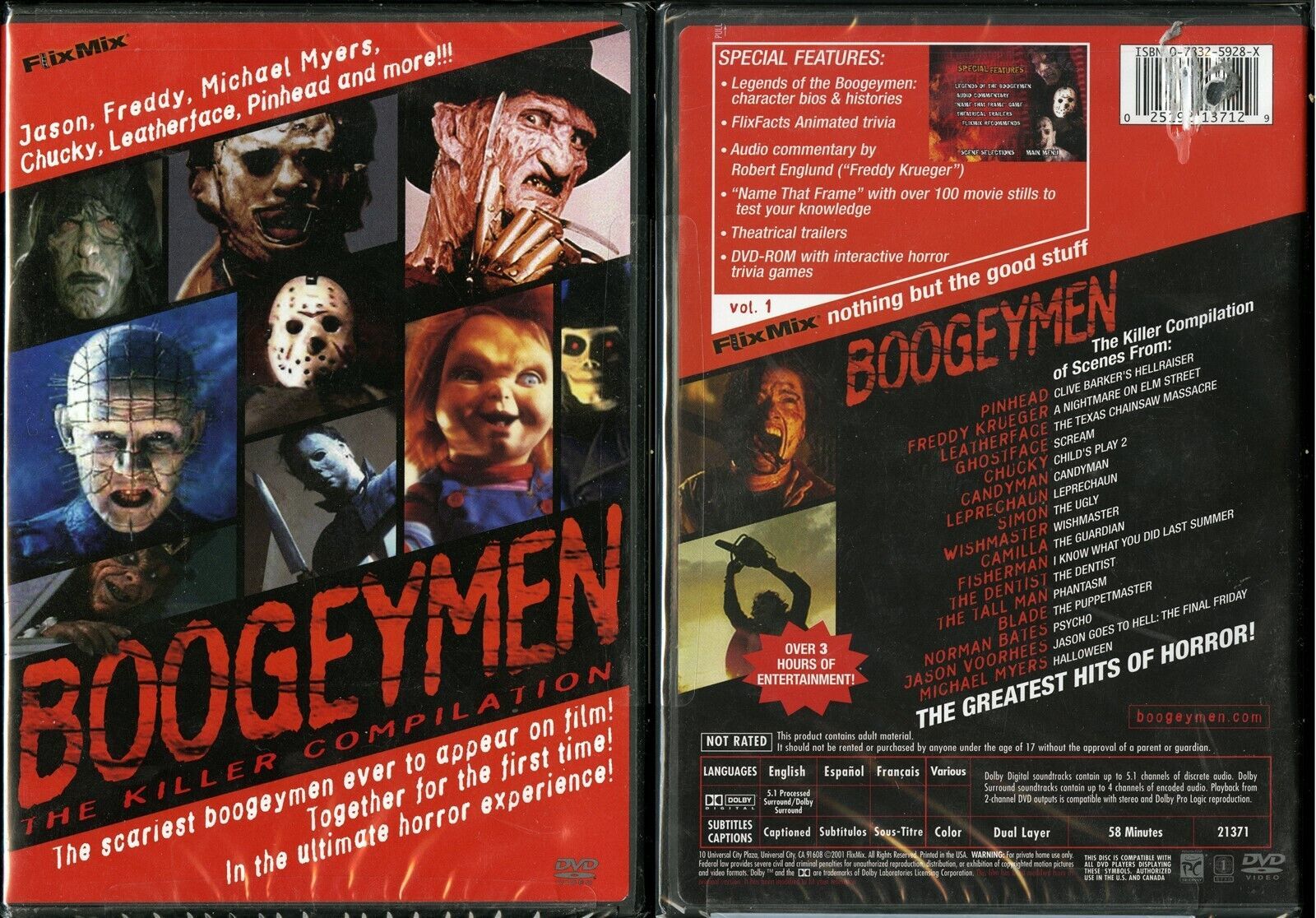 Boogeymen brings together 17 great horror-flick baddies of the last 40 years, ranging from Norman Bates to Leatherface to Freddy Krueger to Chuckie. Accompanying the clips of their dastardly deeds are optional FlixFacts trivia bits and an optional commentary soundtrack from Robert Englund.