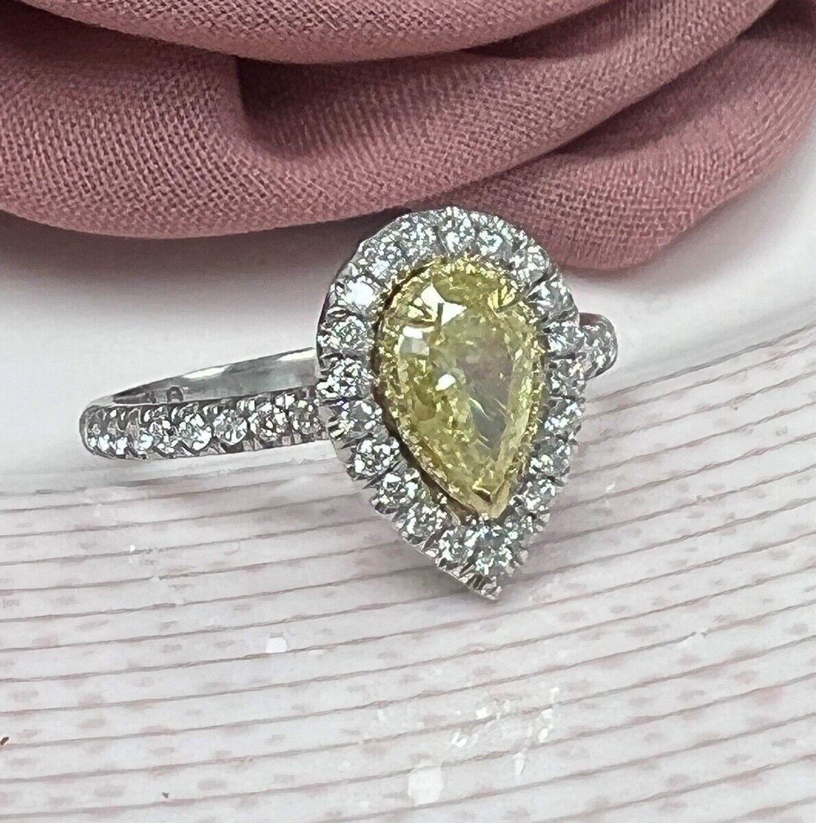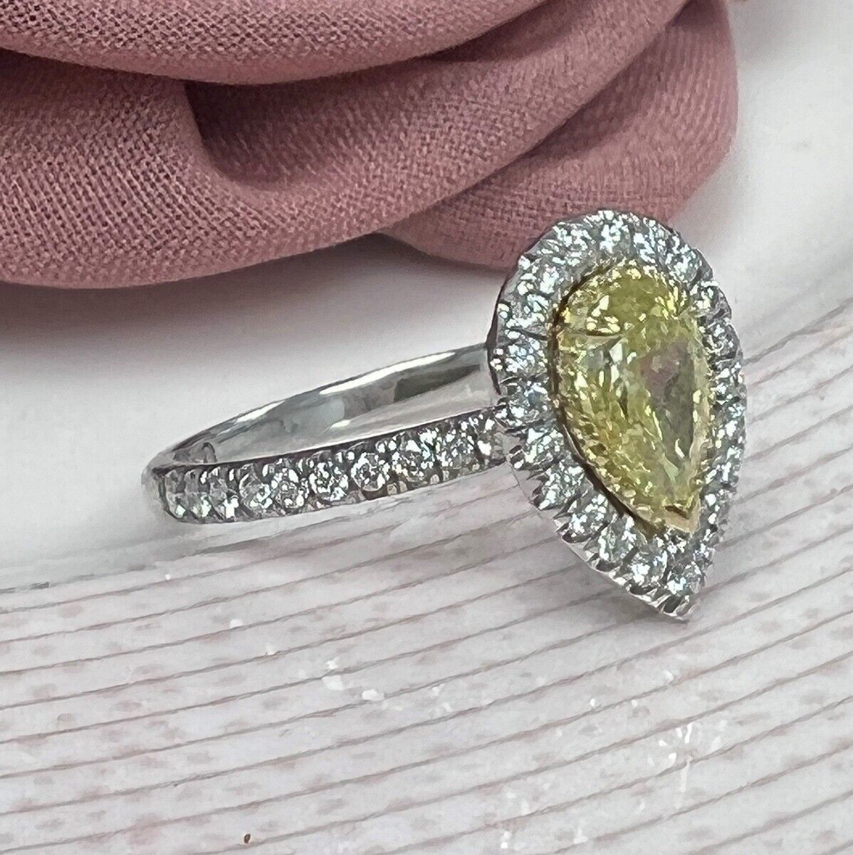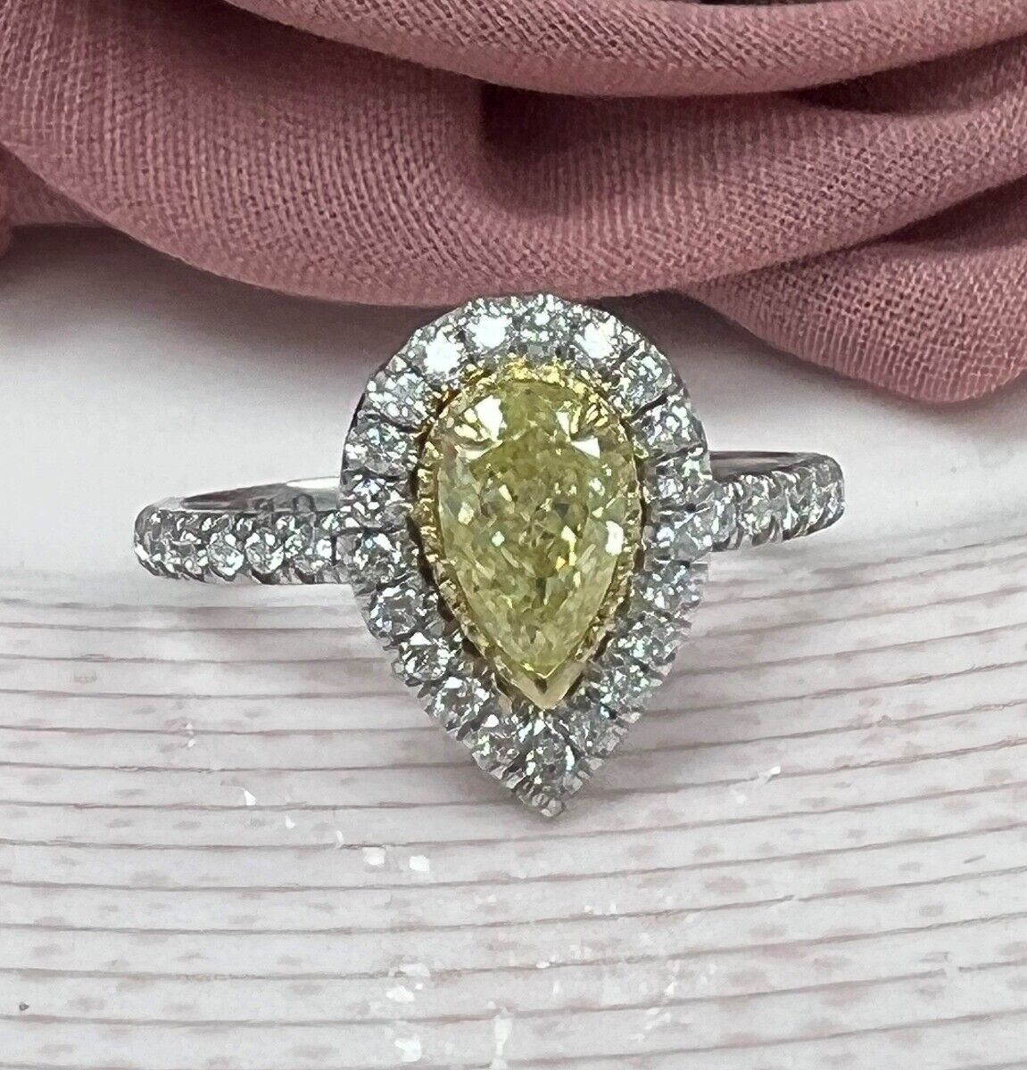GIA 1.08 Ct Fancy Yellow Pear Shaped Diamond Engagement Halo Ring 18k White Gold