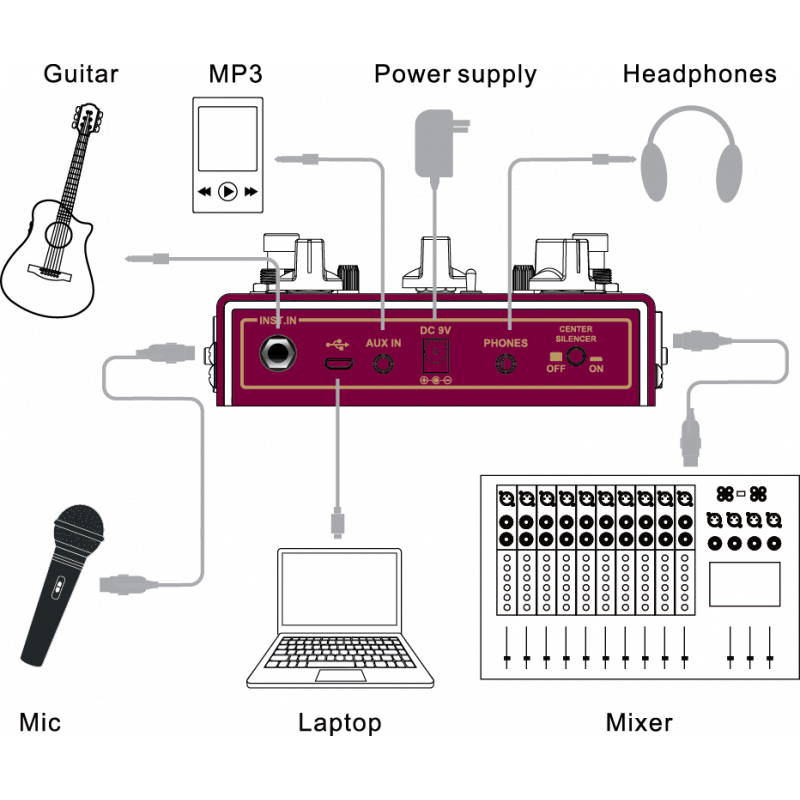 On the rear of the pedal there is a 1/4? mono instrument input, perfect for connecting your guitar or keyboard. This also has the feature of using the reverb effect, but will not process the harmonic of the instrument.