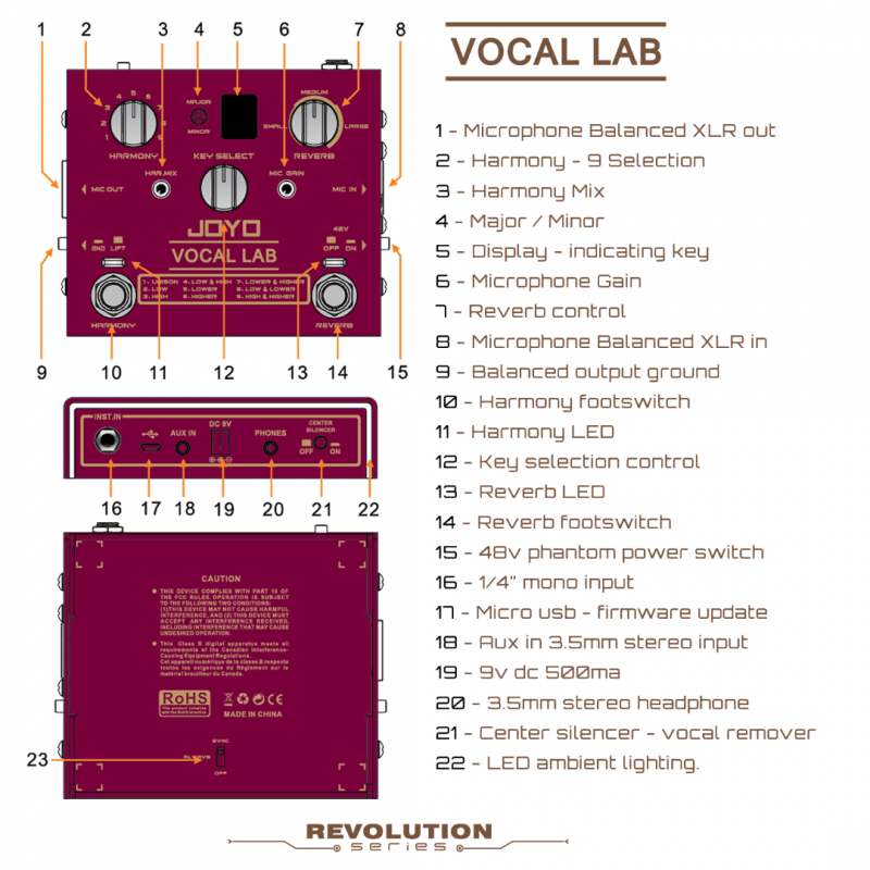 The Vocal lab has a Microphone Balanced XLR in and out perfect for connecting up to a mixer, a direct recording interface or a live PA system. There are 9 options of harmony vocal processing effects available:
