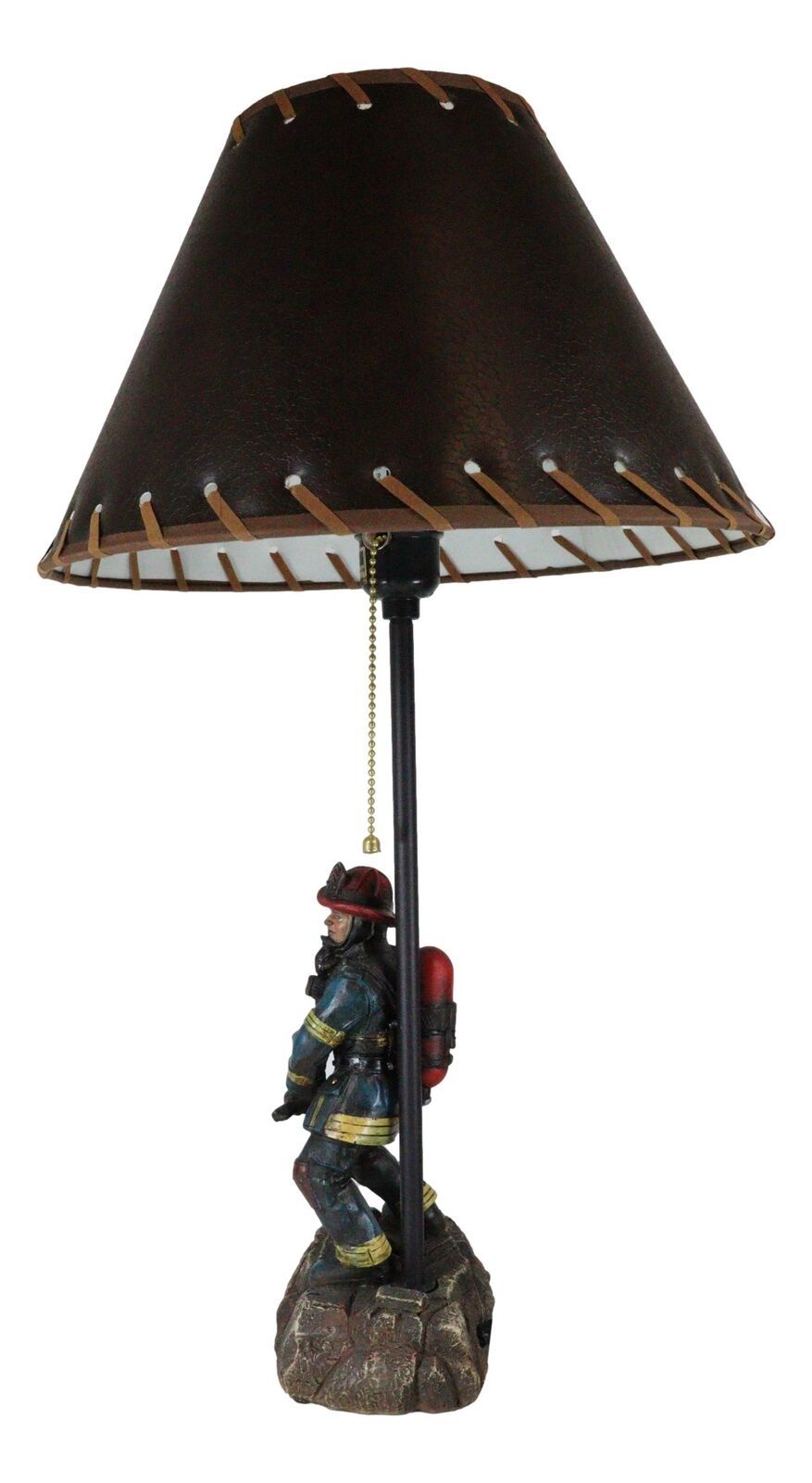 ? This Fire Department Fire Fighter Table Lamp comes with the shade as pictured. Made of polyresin, hand painted and polished, the quality finish is superb! The shade is made of laced paper textured in leather-like finish. The top and bottom fringes of the shade has lace stripes.