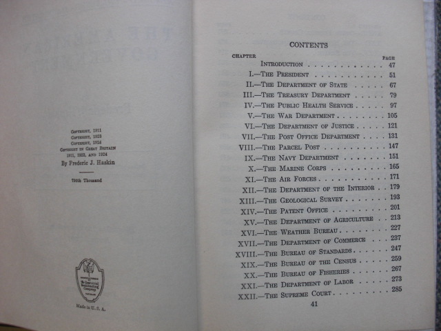 This book was reprinted by the author in 1924. The book being offered was printed in 1924. A rather interesting overview of the first department's a United States government such as public health service Marine Corps geological survey, Bureau of standards, the Senate, interstate commerce commission, Panamรก Canal, Hotline possession