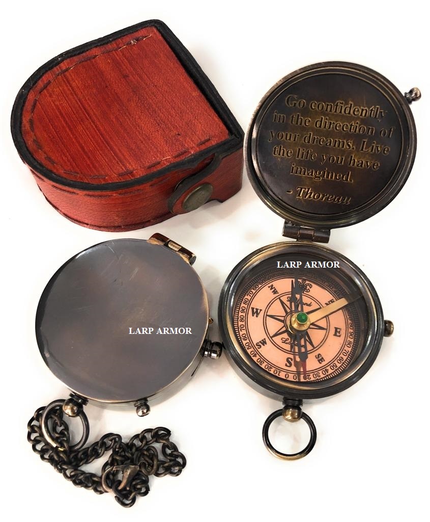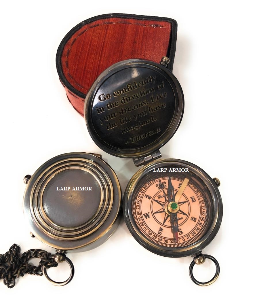 Personalized Gift Compass: Brass Engraved Compass with Stamped Leather case. Brass Compass "GO CONFIDENTLY IN THE DIRECTION OF YOUR DREAMS LIVE THE LIFE YOU HAVE IMAGINED". Under the glass cover is beautiful, the high-quality jewelled compass needle settles to the North very quickly for timely and accurate readings. It has a small lever on the side of the compass that operates a needle lift mechanism to protect the compass bearing. Gift for someone you love. Engraved message of the Compass.