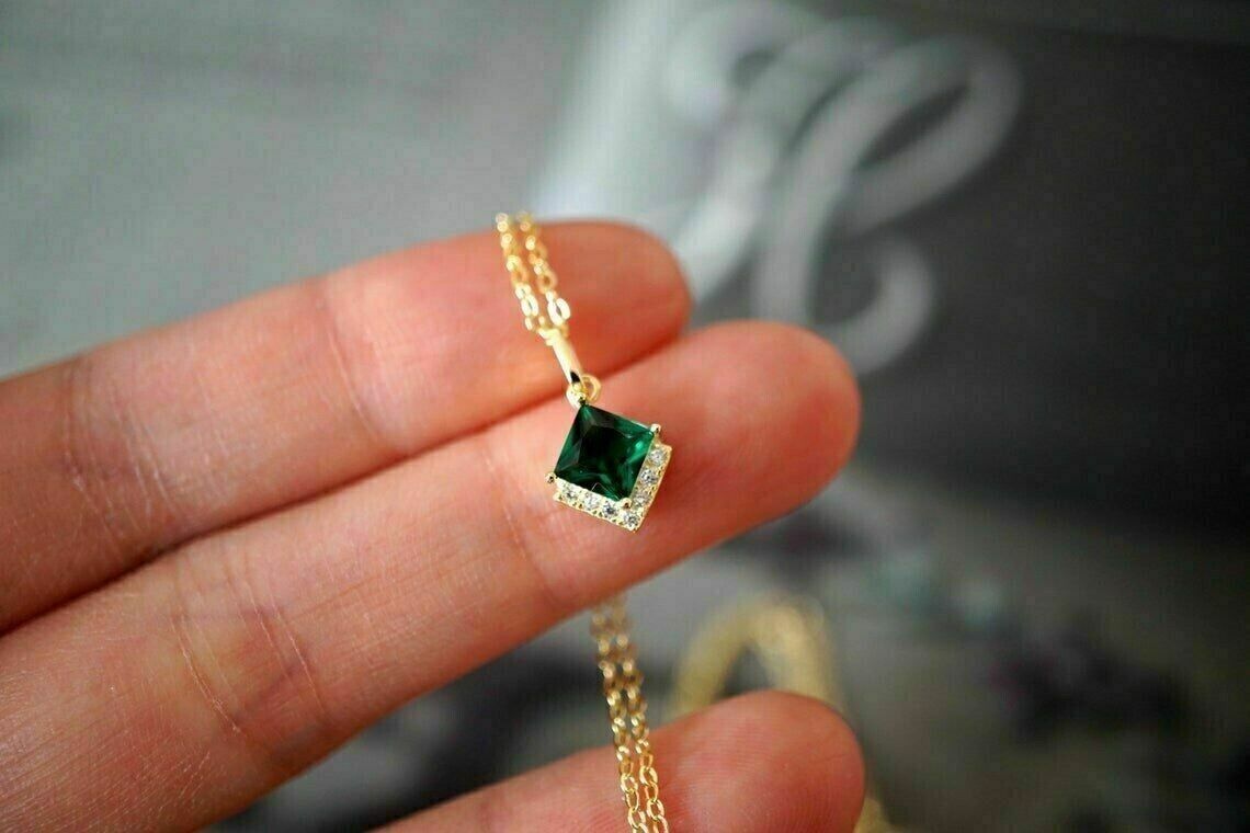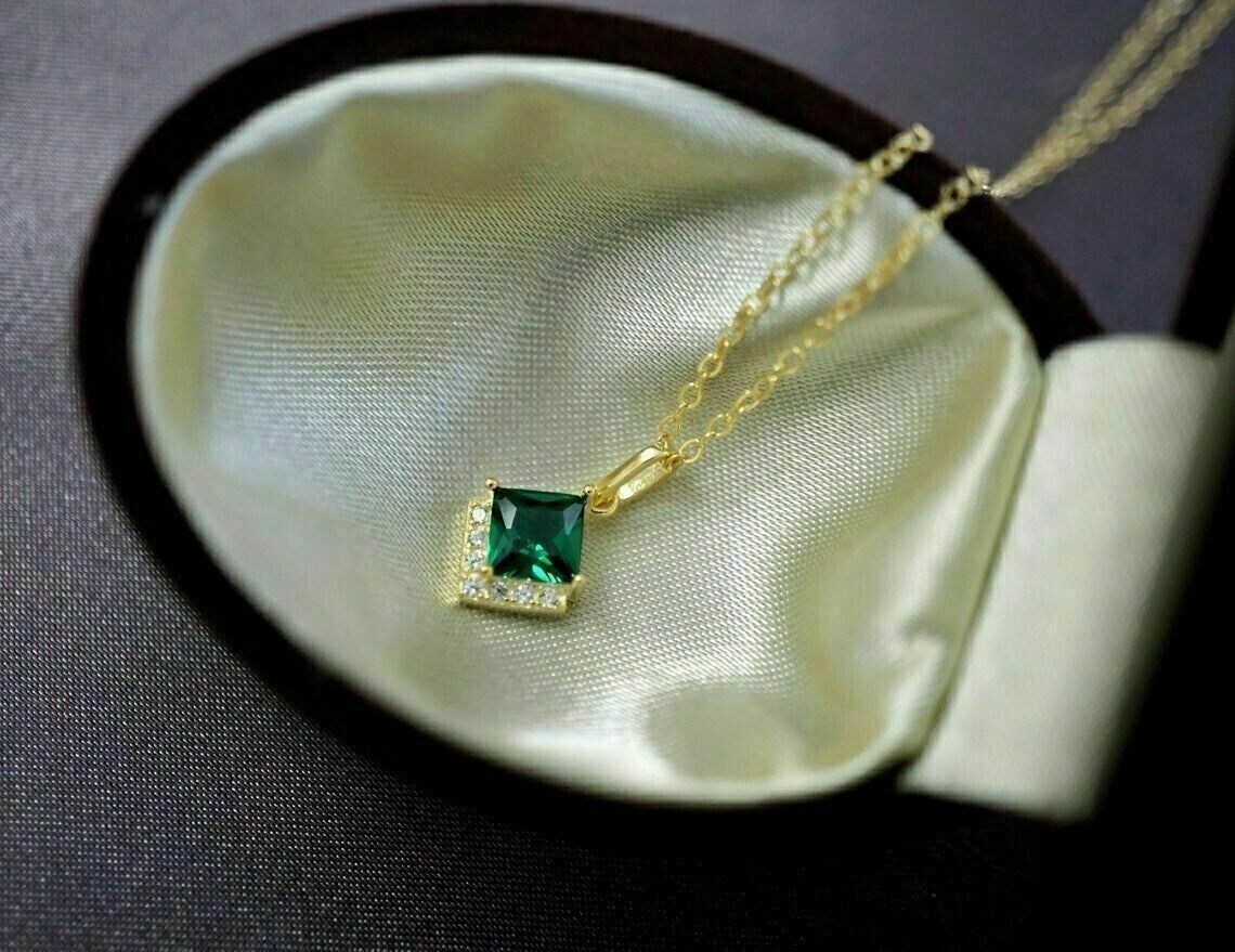 2.50Ct Princess Cut Emerald Simulated Women's Pendant 14K Yellow Gold Finish