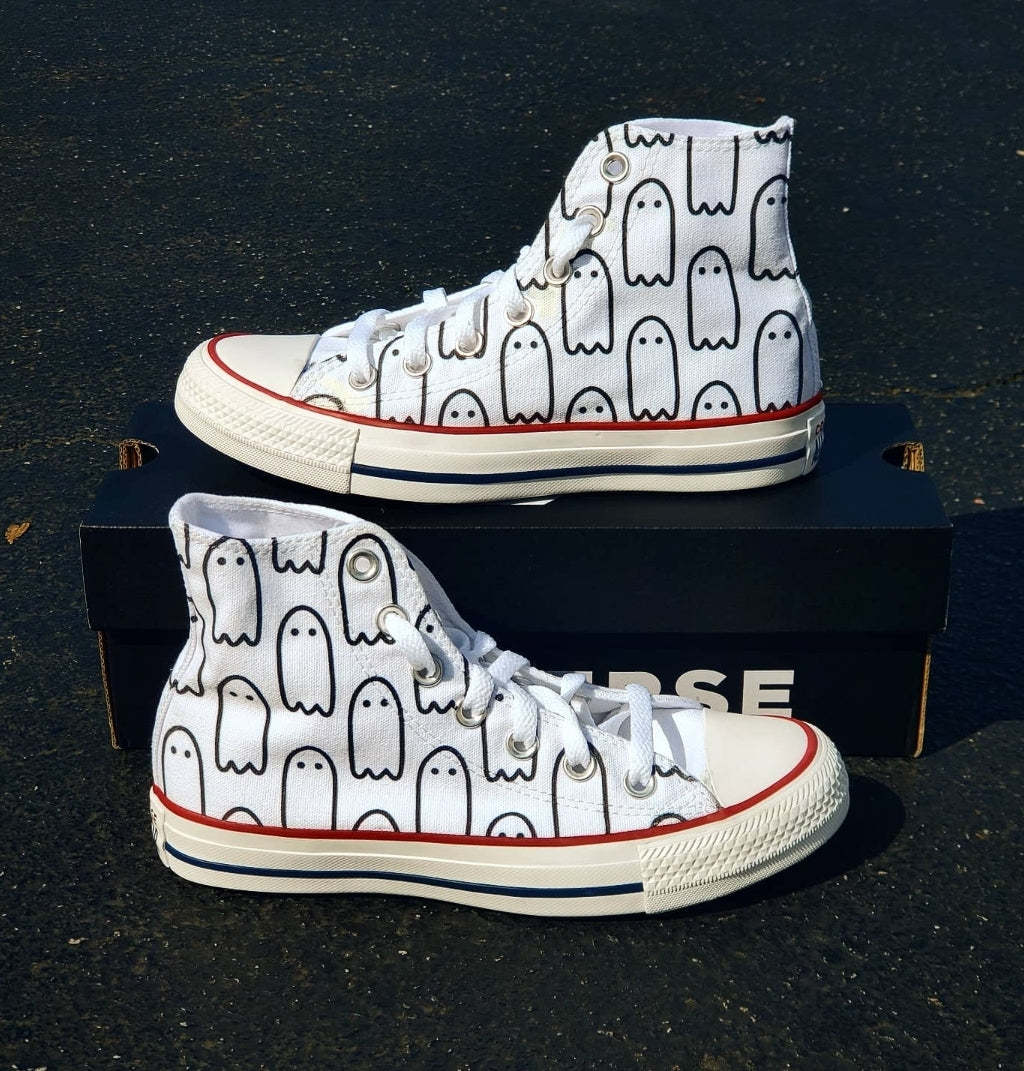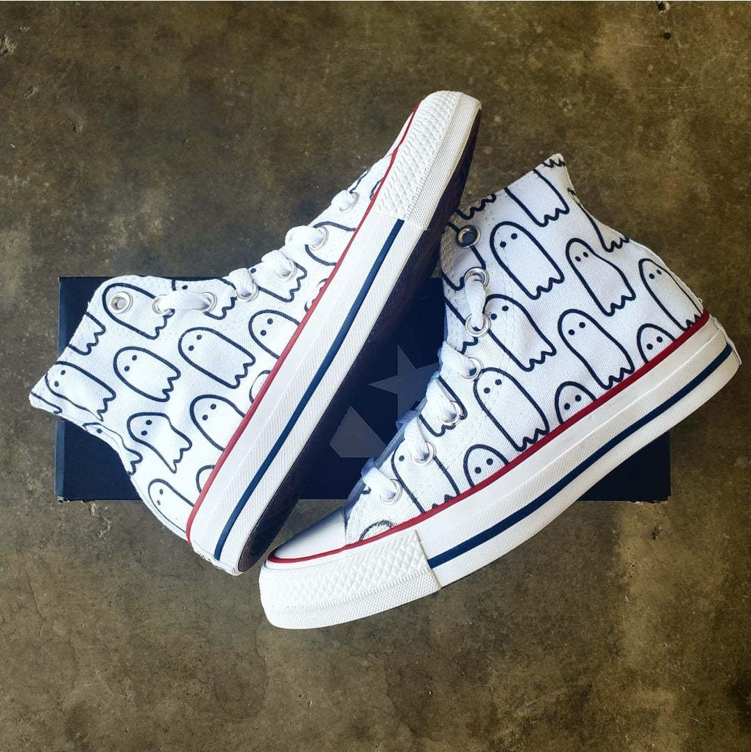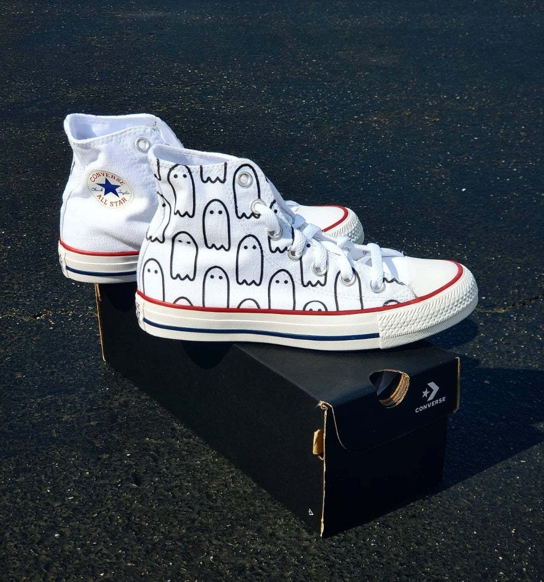 Local artist, Dylan Fellhoelter, has his custom designs from Inktober on High-Top Converse. The design has his Ghost design on the outside of both shoes!
