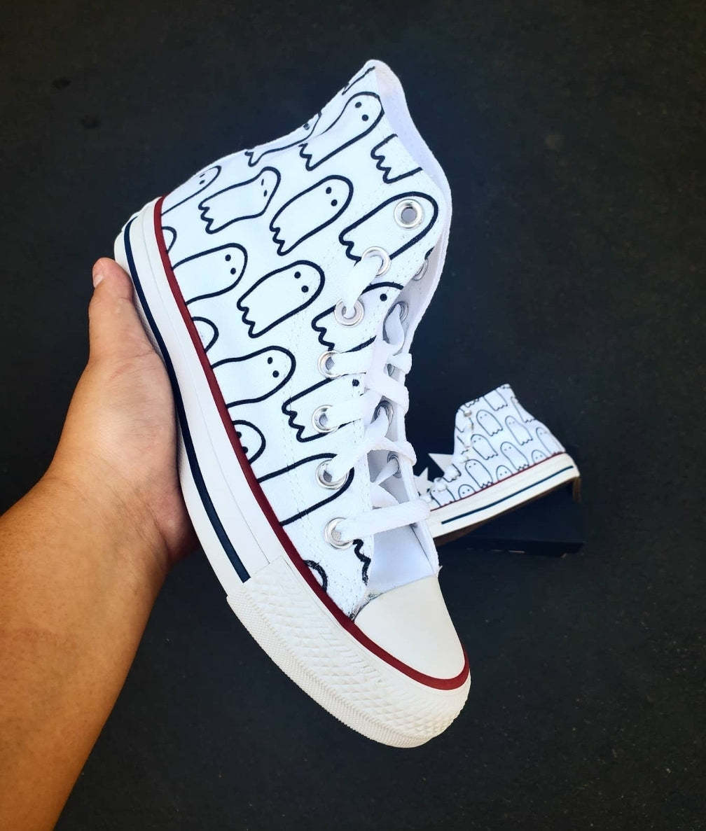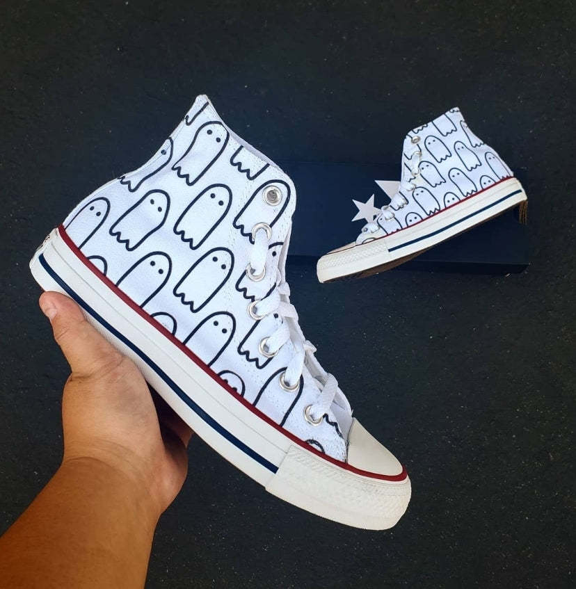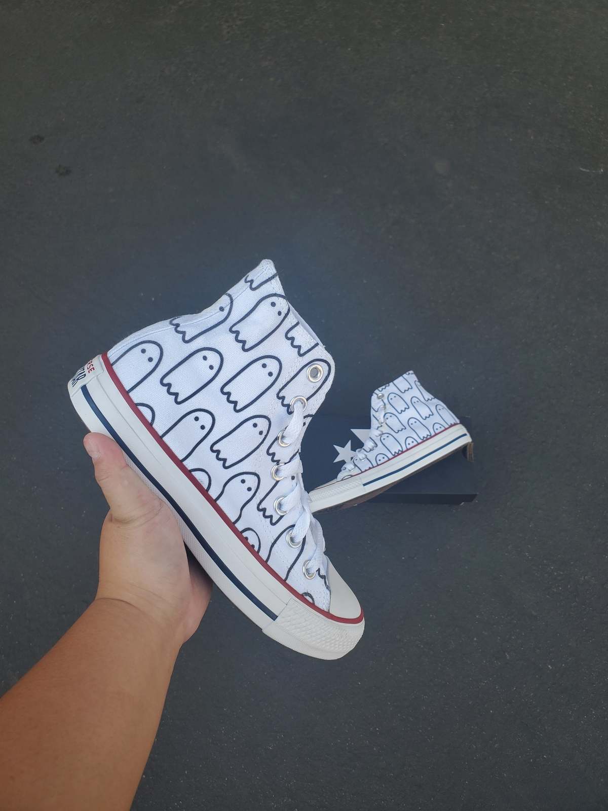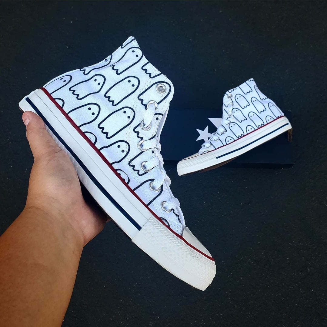 Local artist, Dylan Fellhoelter, has his custom designs from Inktober on High-Top Converse. The design has his Ghost design on the outside of both shoes!
