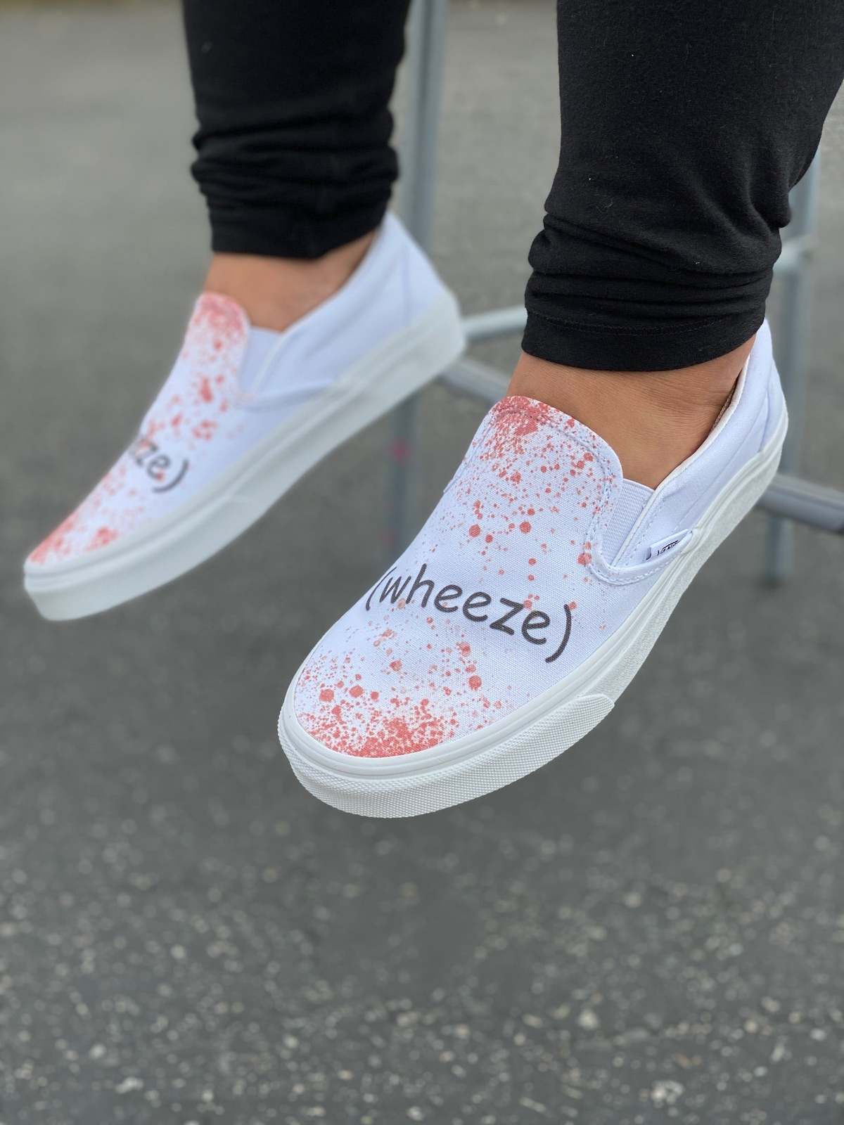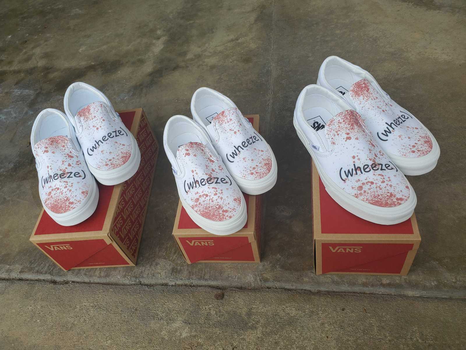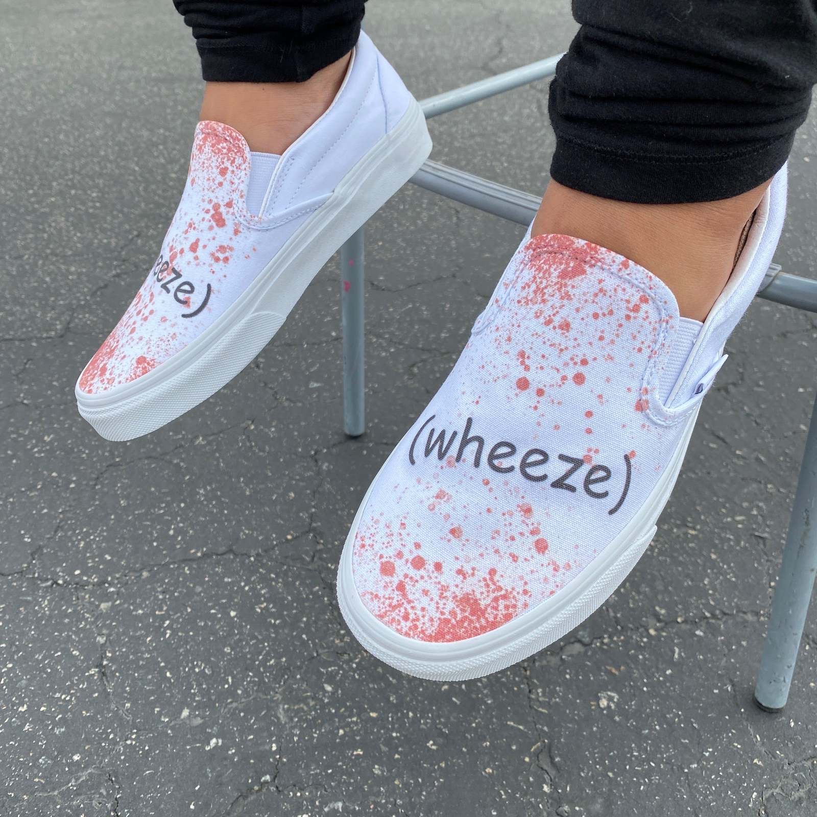 These shoes are covered in the blood left behind from the mysterious murders explored in your favorite True Crime video. On the tops of both shoes, the iconic "(wheeze)" is in black.