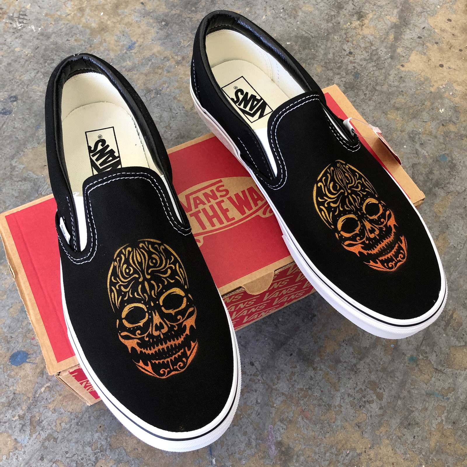 Celebrate the lives of the deceased and represent to your Mexican heritage with these Dia De Los Muertos Slip-On Vans! The colors of the sugar skulls were inspired by the glow of the beautiful Marigolds.