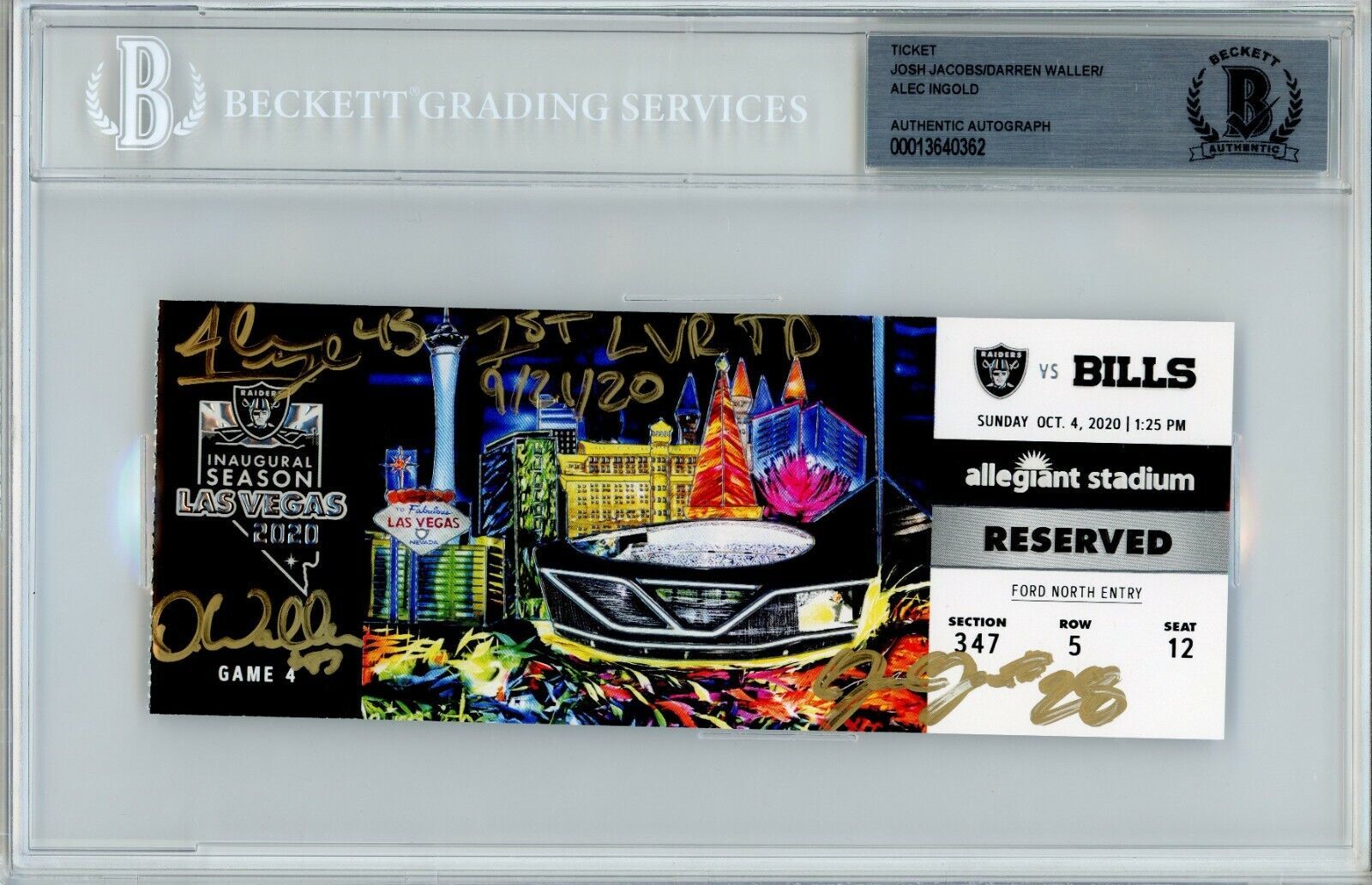 Looking for that next great item to add to your memorabilia collection? Well, this is it! Las Vegas Raiders 2020 Inaugural Season Commemorative Ticket Signed by Darren Waller, Josh Jacobs and Alec Ingold!! This is a true piece of Las Vegas Raiders memorabilia as this is a commemorative ticket issued only to season ticket holders to commemorate their 1st season in Las Vegas and because the Covid Pandemic shut down the ability for fans to attend the games in person. This ticket was made for the Raiders game vs. the Buffalo Bills on October 4, 2020, at Allegiant Stadium in Las Vegas. This ticket came in a ticket booklet in the 2020 season ticket holder's gift box as a replacement to the real tickets the season ticket holders would have received like they normally do at the beginning of each season. The actual section, row and seat numbers you see indicated on the ticket, is the actual seat of that exact season ticket holder for the seats they would have had if the games were open to fans!1 This will forever link the Raiders' 1st ever season in Las Vegas and how their first year literally had no fans in attendance. The ticket has been signed by the only 2 Pro Bowlers on the team that Inaugural season in Tight End Darren Waller and Running back Josh Jacobs and also by Alec Ingold who signed the ticket and hand inscribed it with "1st LVR (Las Vegas Raiders) TD (Touchdown) 9/21/20" in which he scored the 1st Touchdown ever in Las Vegas at Allegiant Stadium! Wow!! This is an awesome piece of 1st Year Ever Las Vegas Raiders Memorabilia and will forever hold its value for this reason! The tickets are beautifully designed with foil embellished with raised lettering in a number of places throughout on the front of the ticket. Certificate of Authenticity: The autographs on this item has been certified authentic by Beckett Authentication Services, one of the largest amp; most reputable memorabilia companies in the industry. The ticket is sealed in the permanent capsule, as you can see, and the authentication number can be found in the top right corner of the holder on the front. You can go on their online authentication database website and type that number in and up with pop the Certificate of Authenticity for life. Note: This is a stock item and stock images are used in this listing. The exact item you will receive will be of equal quality condition wise to the one pictured. Autograph quality, size and location will vary.