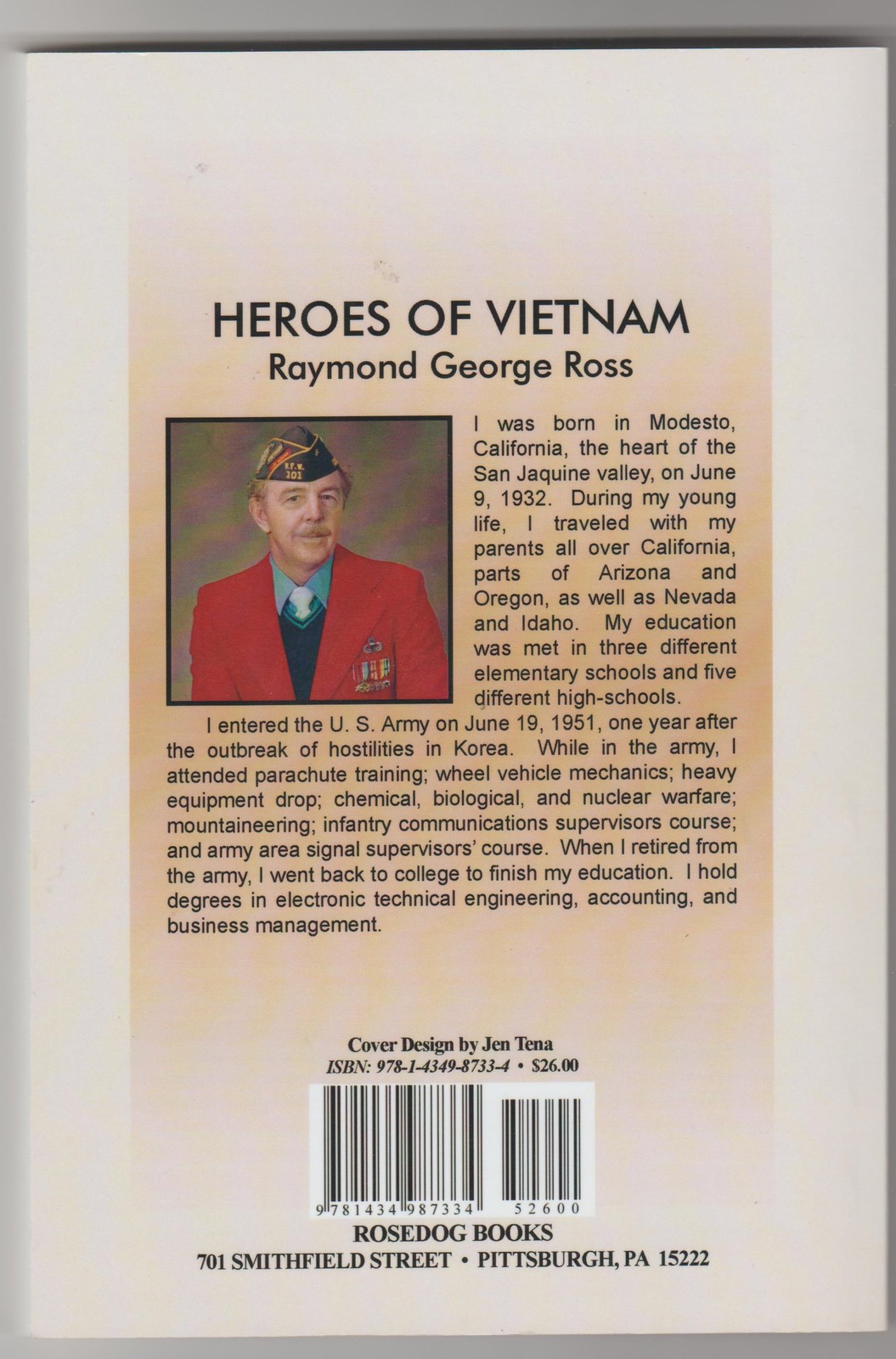 HEROES OF VIETNAM by Raymond George Ross RoseDog Books, reprint (1st softcover?), 2011 Condition: Fine The author relates his experiences in the Vietnam War. His book, he says, gives a truer picture of what the war was like than many better-known books, such as THE GREEN BERETS. It reads much like a novel. Illustrated with photos throughout.