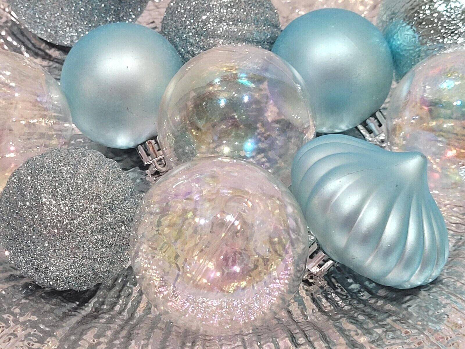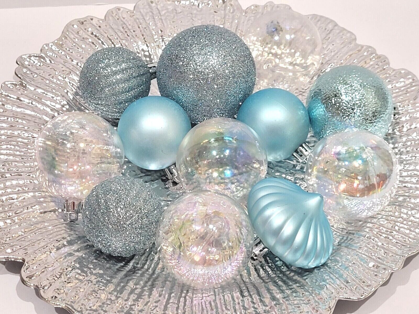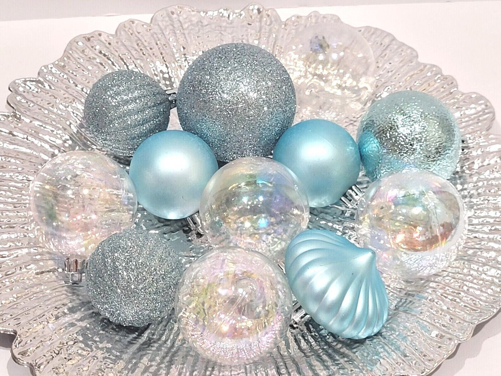 Up for sale we have these stunning plastic ornaments for your beach theme decor. There are 12 ornaments in the set. These are sooo pretty and would look great on a tree, garland or wreath. The colors are lt blue and iridescent clear plastic. There are 3 different sizes (including tip) they measure 2.25", 2.75" and (1) 3" ornament. These will not come in original box to keep shipping cost down.