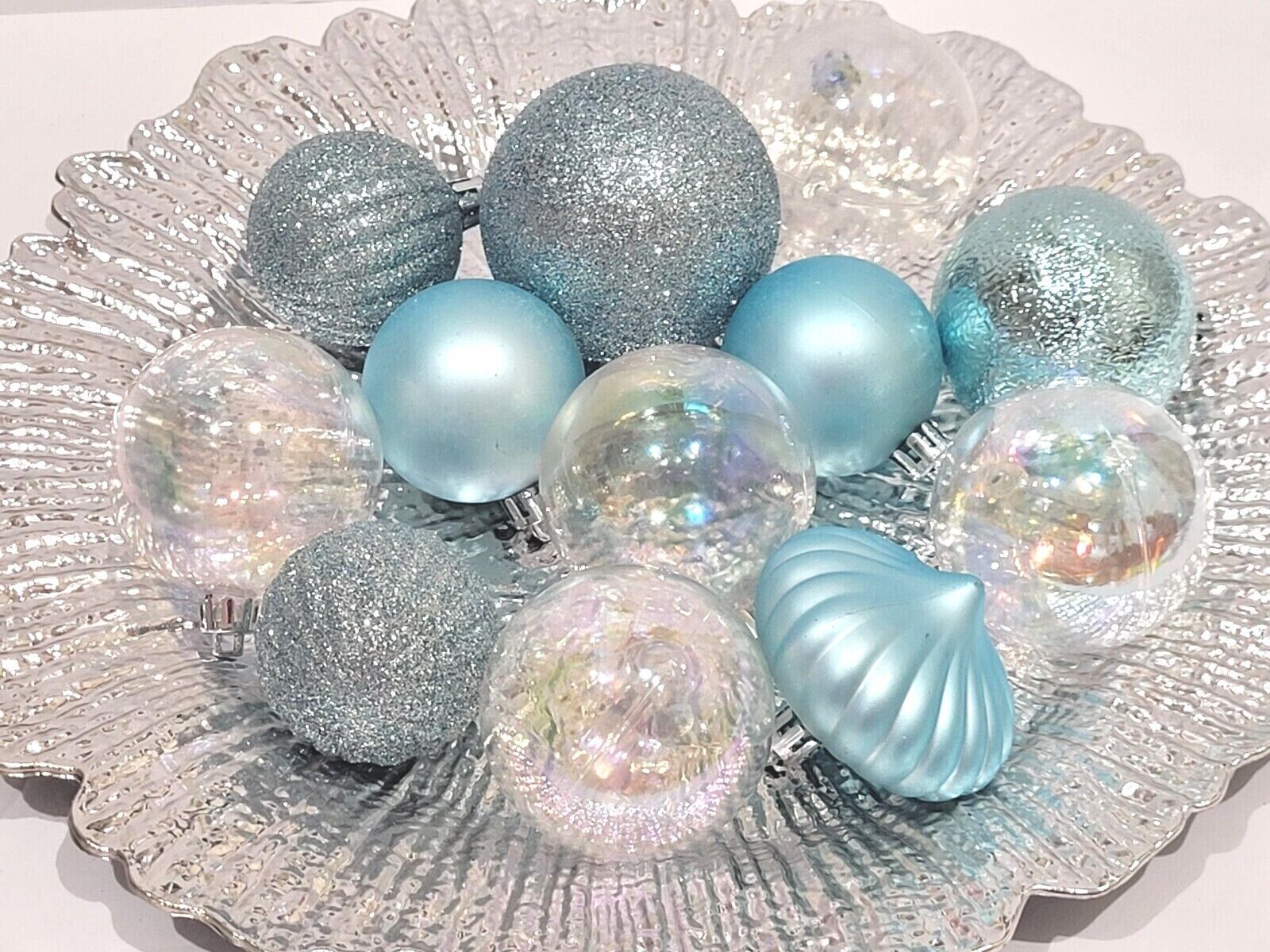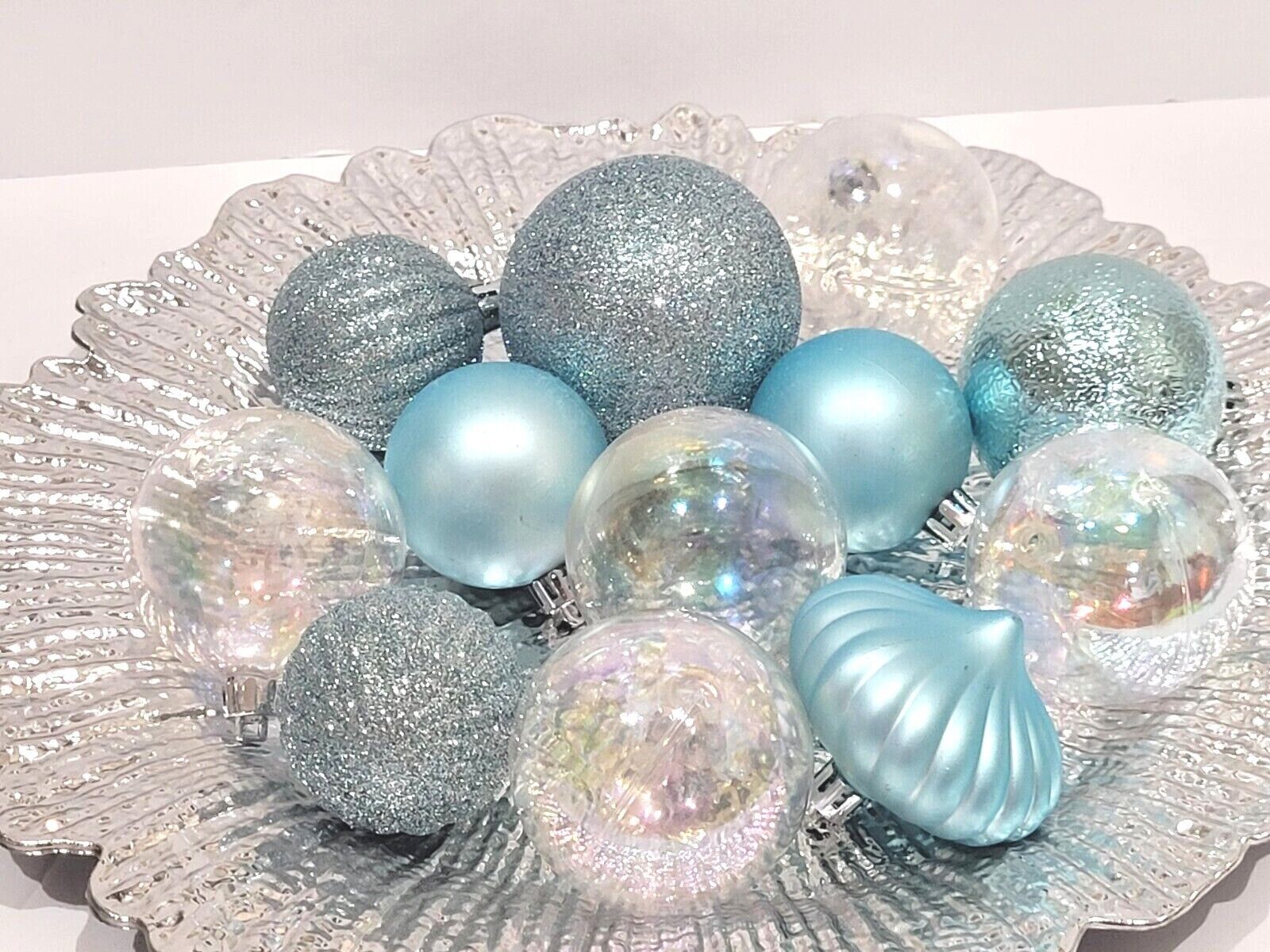 12 Christmas Coastal Beach Aqua Blue Clear Plastic Glitter Ornaments Decor 2.5"