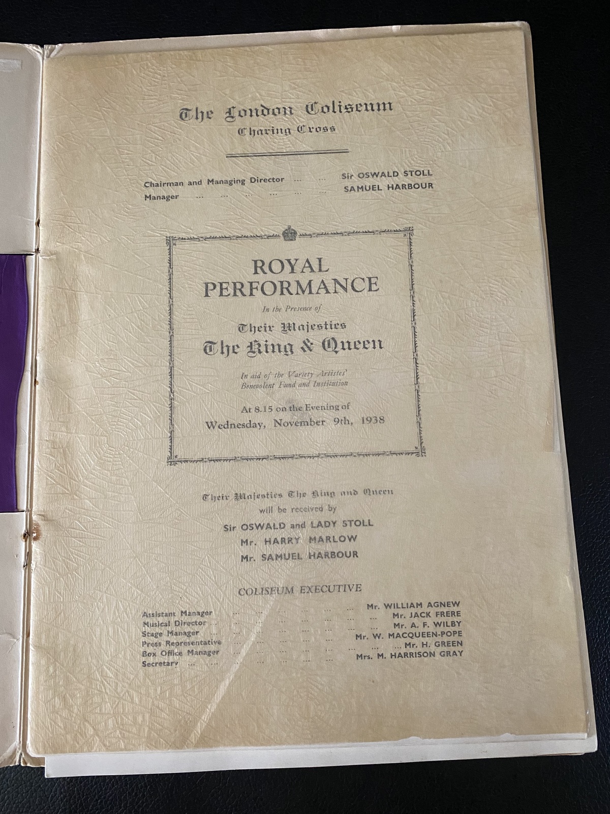 No one could have known it at the time, but the 1938 Royal Variety Performance – held at the Coliseum for the first time in ten years – was to be the last until after the War, in 1945. The finale to the show – involving around 250 artistes – was the biggest ever for a Royal Variety Show and seemed an appropriate if unintentionally grand way to signal the grim and desperate years ahead. Many of the performers were to provide vital work over the next years in boosting the morale of our troops all around the world.