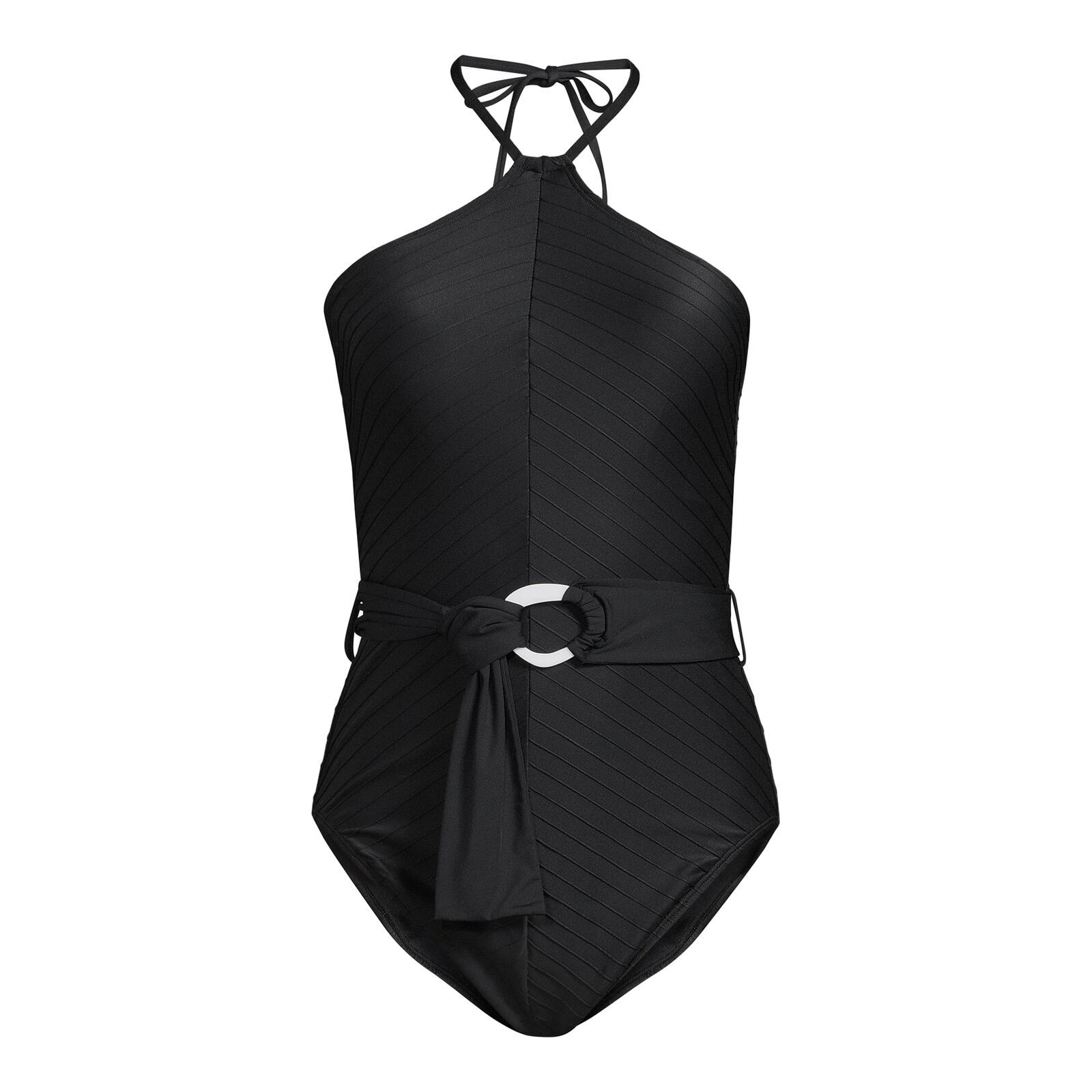Beach bound! This beautifully detailed One-Piece Swimsuit from Time and Tru features contrast prints with pintucking all throughout. A soft belt meets at the center front and loops through a resin organic shaped ring to give adjustability while maintaining a sleek, splash-worthy look. This bathing suit is also highlighted by its classic bikini coverage to keep you comfortable and covered so you can lounge in style