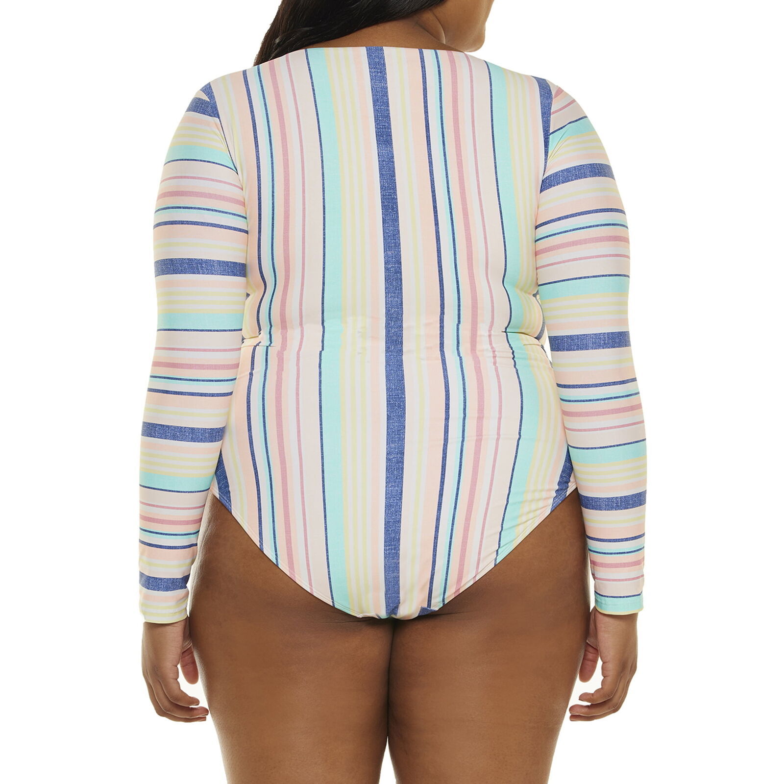 Think Pink in this rash guard one piece from Celebrity Pink! Flattering high leg and front cut out with faux tie and removable cups. It is lined with recycled polyester (sleeves are unlined) and the shell is made from 82% Nylon and 18% Spandex. Imported. Celebrity Pink - California-inspired swimwear designed for the girl who values both fashion and quality.