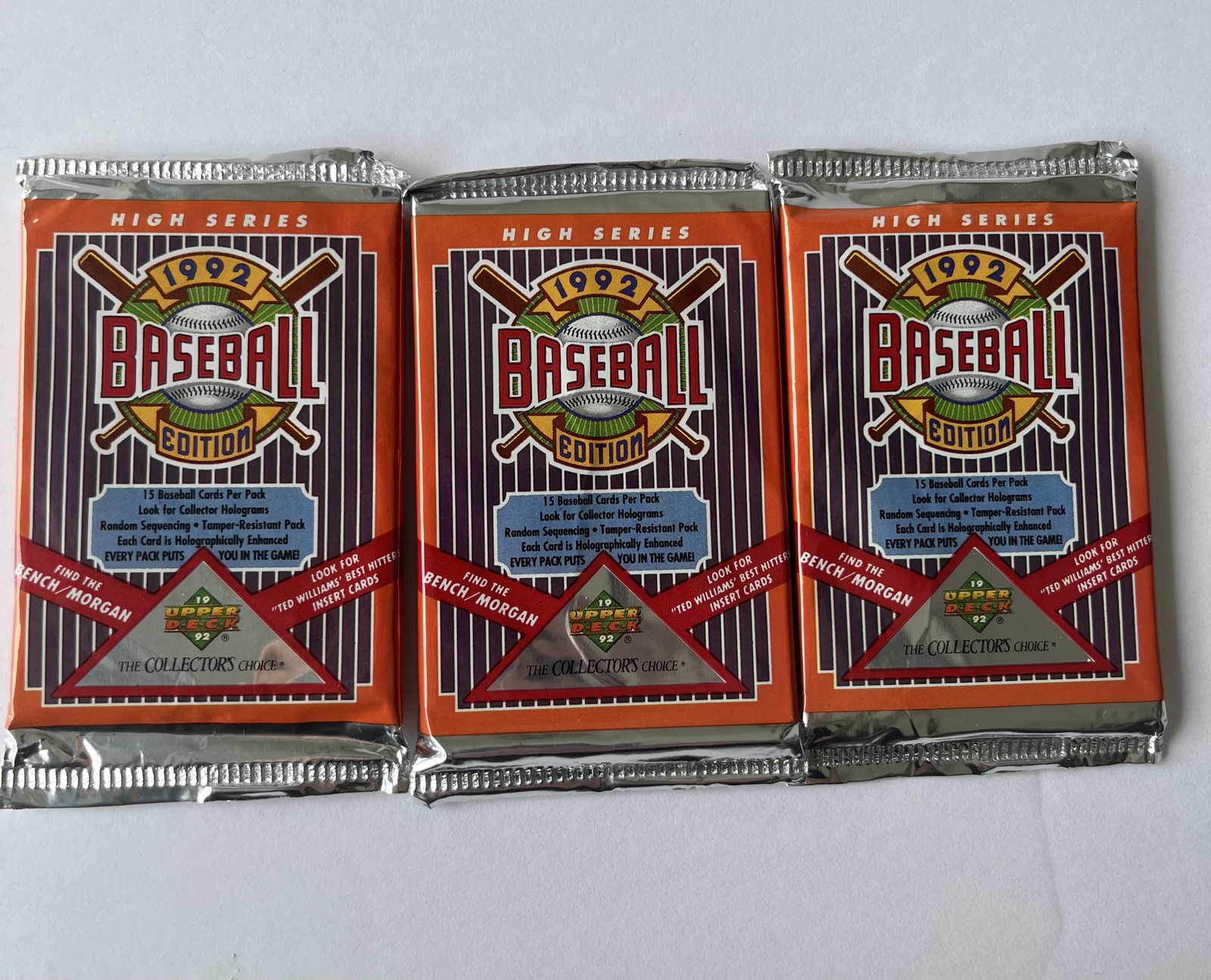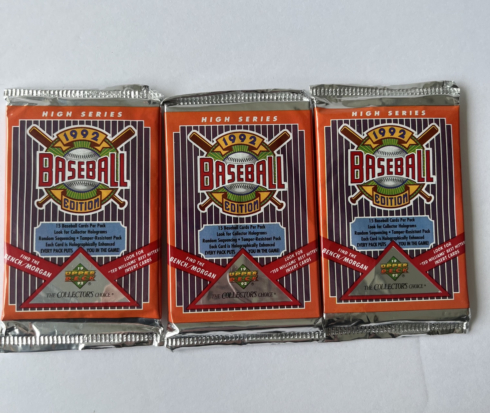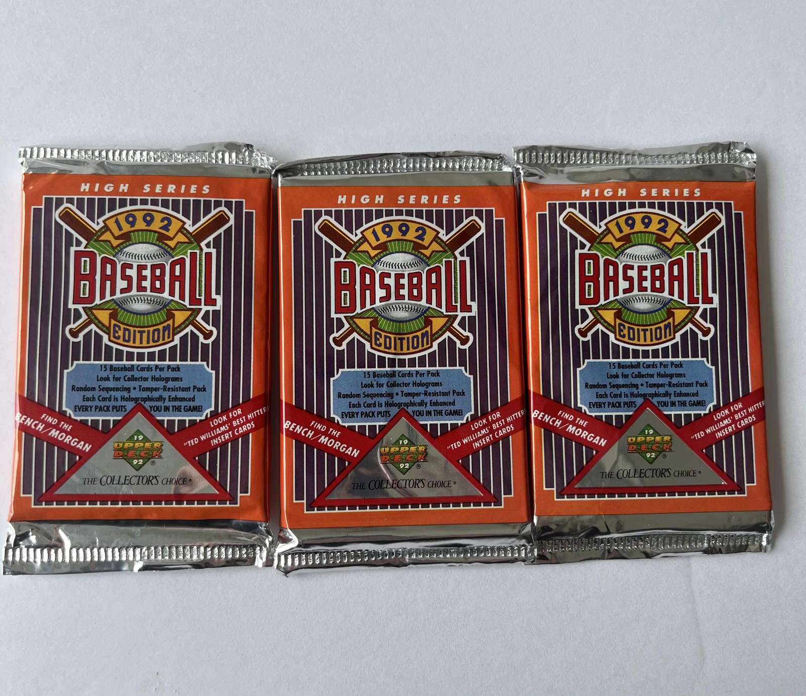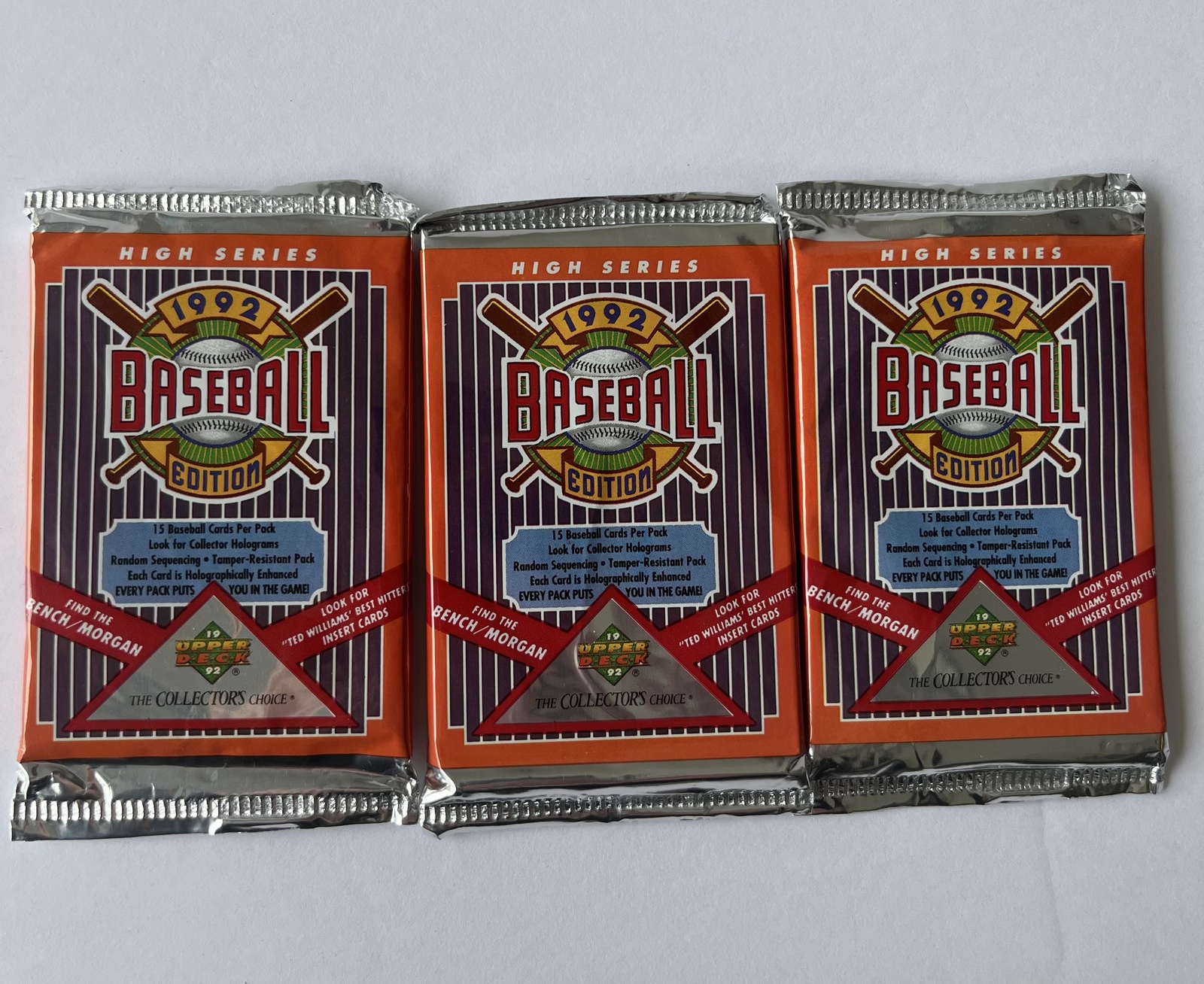 These cards are Vintage High Series 1992 Baseball cards. You get 3 packs of cards with 15 cards in each pack for a total of 45 cards. Each card is holographically enhanced. Look for Bench/Morgan "Baseball Heroes" cards. Also, the Highly Sought after Bench/Morgan "Baseball Heroes" autograped cards. And dont forget to look for the "Ted Williams Best Hitters" cards. Oh ya, and the regular Hall of Fame Players like Ken Griffey JR. Jim Thome, Pedro Martinez, Nolan Ryan, and all the rest from this Golden Era of Baseball