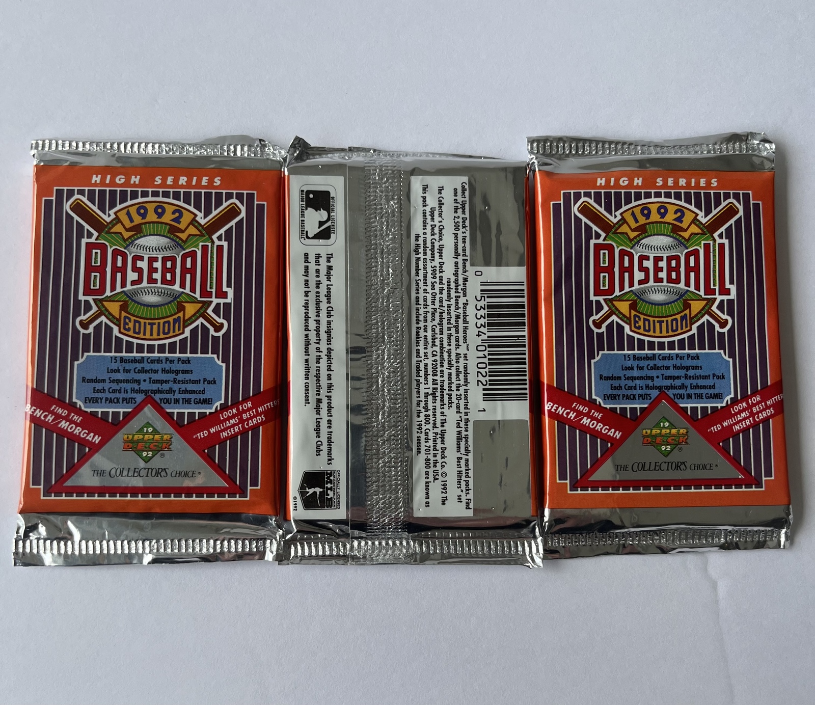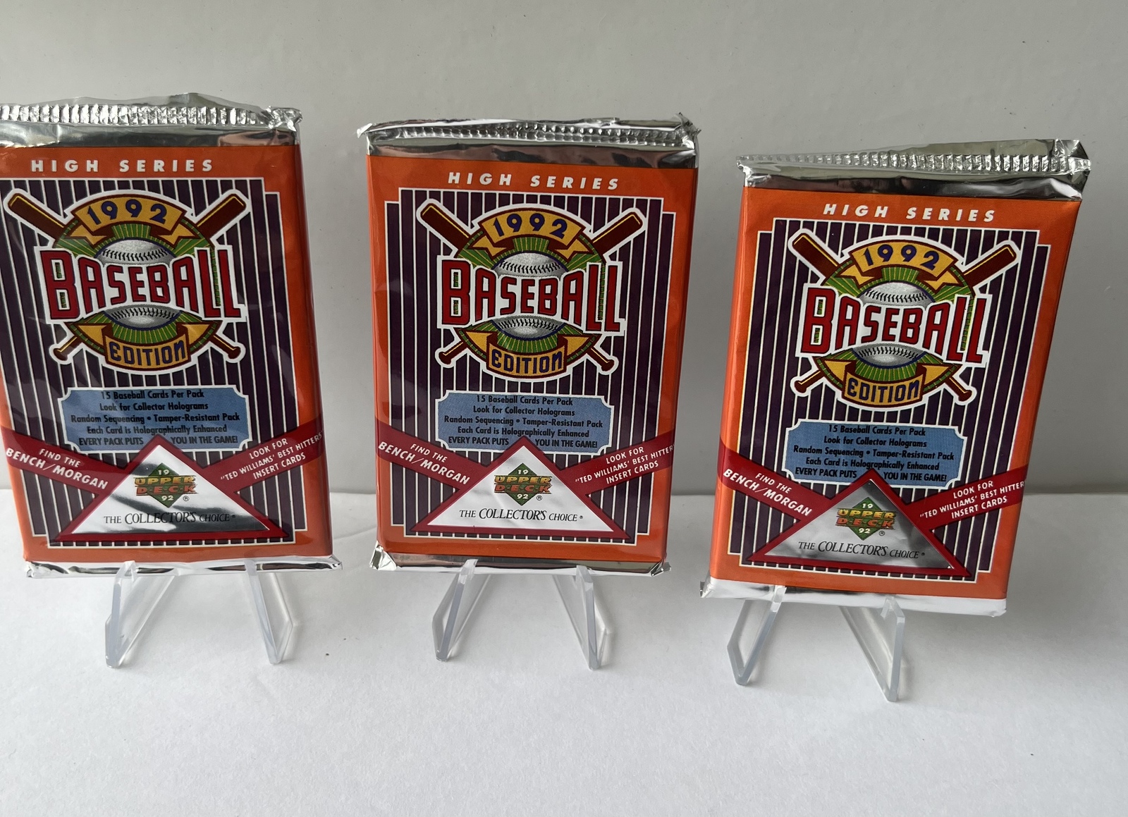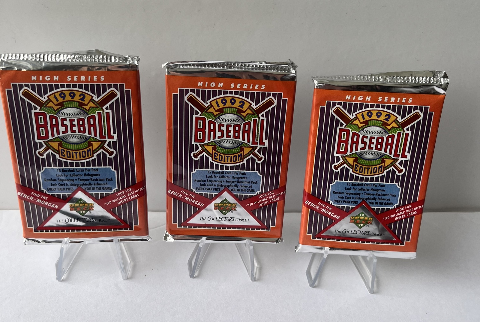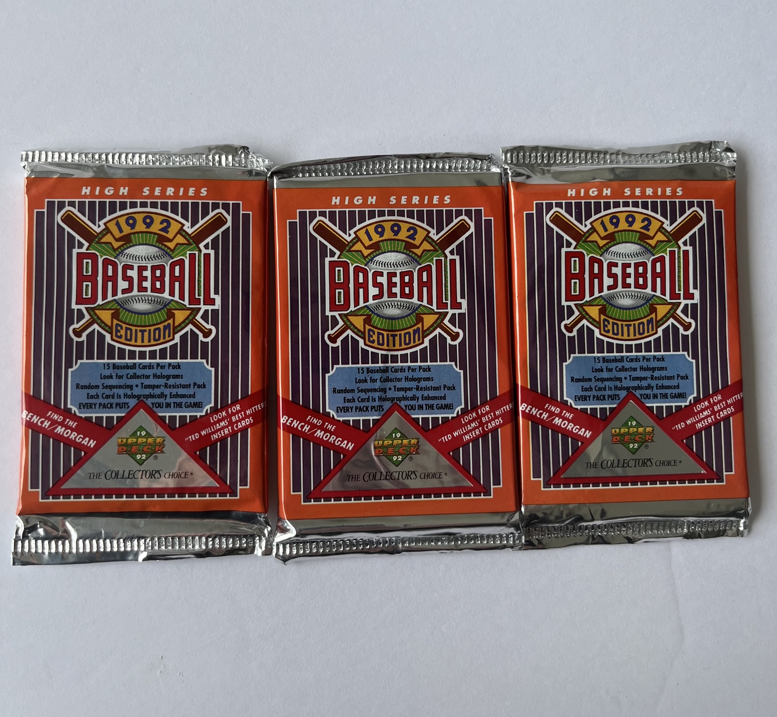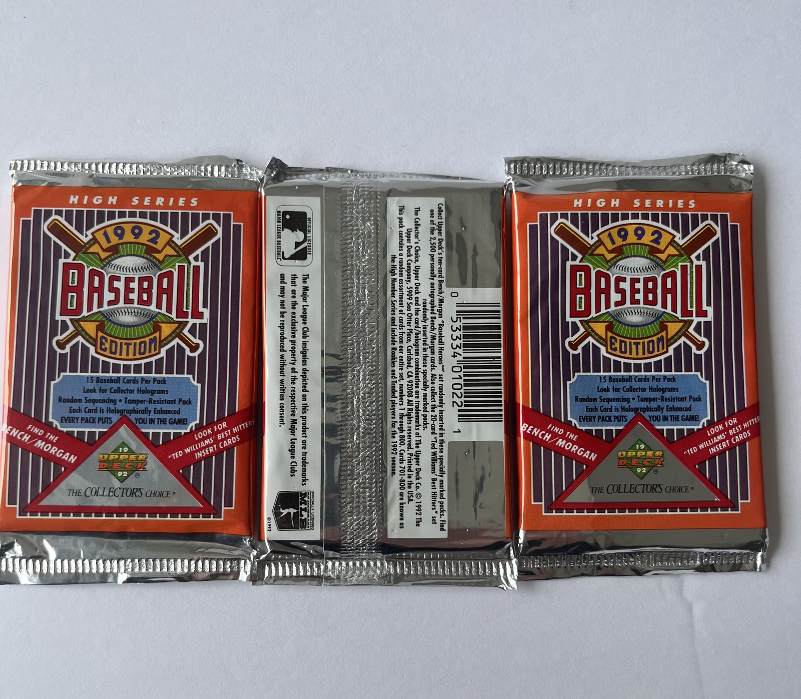 These cards are Vintage High Series 1992 Baseball cards. You get 3 packs of cards with 15 cards in each pack for a total of 45 cards. Each card is holographically enhanced. Look for Bench/Morgan "Baseball Heroes" cards. Also, the Highly Sought after Bench/Morgan "Baseball Heroes" autograped cards. And dont forget to look for the "Ted Williams Best Hitters" cards. Oh ya, and the regular Hall of Fame Players like Ken Griffey JR. Jim Thome, Pedro Martinez, Nolan Ryan, and all the rest from this Golden Era of Baseball
