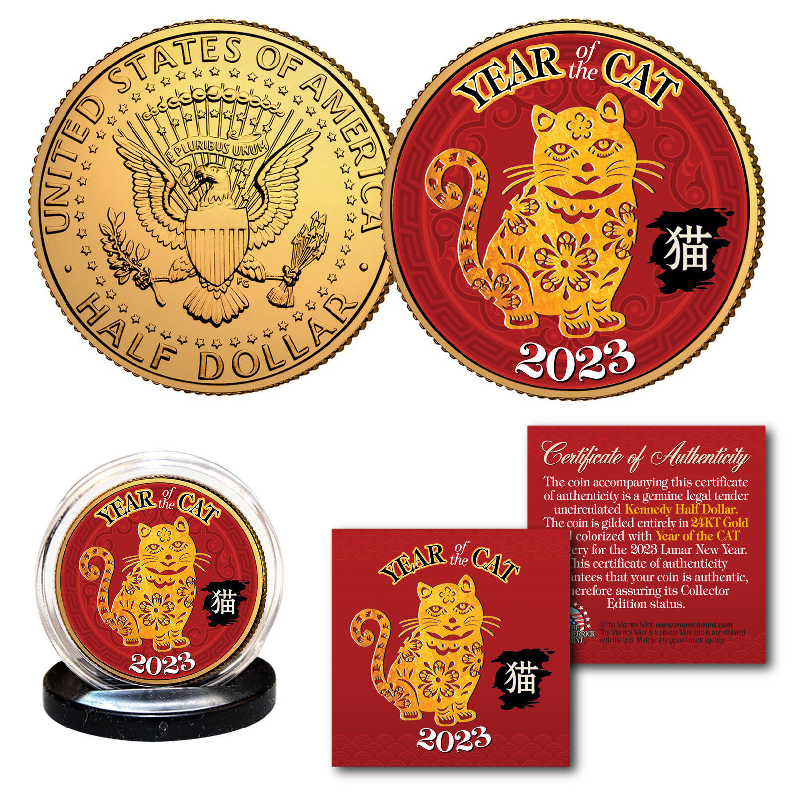 2023 Vietnamese Lunar New YEAR OF CAT 24K Gold Plated JFK Half Dollar Coin BOX