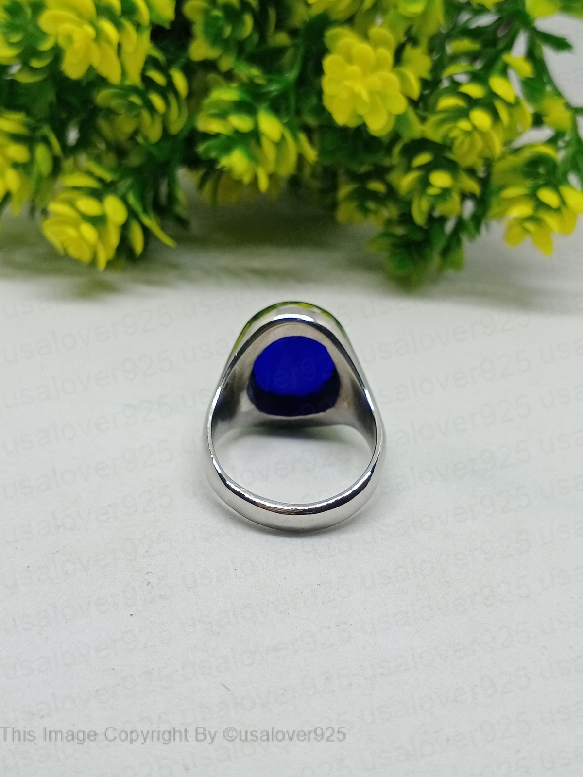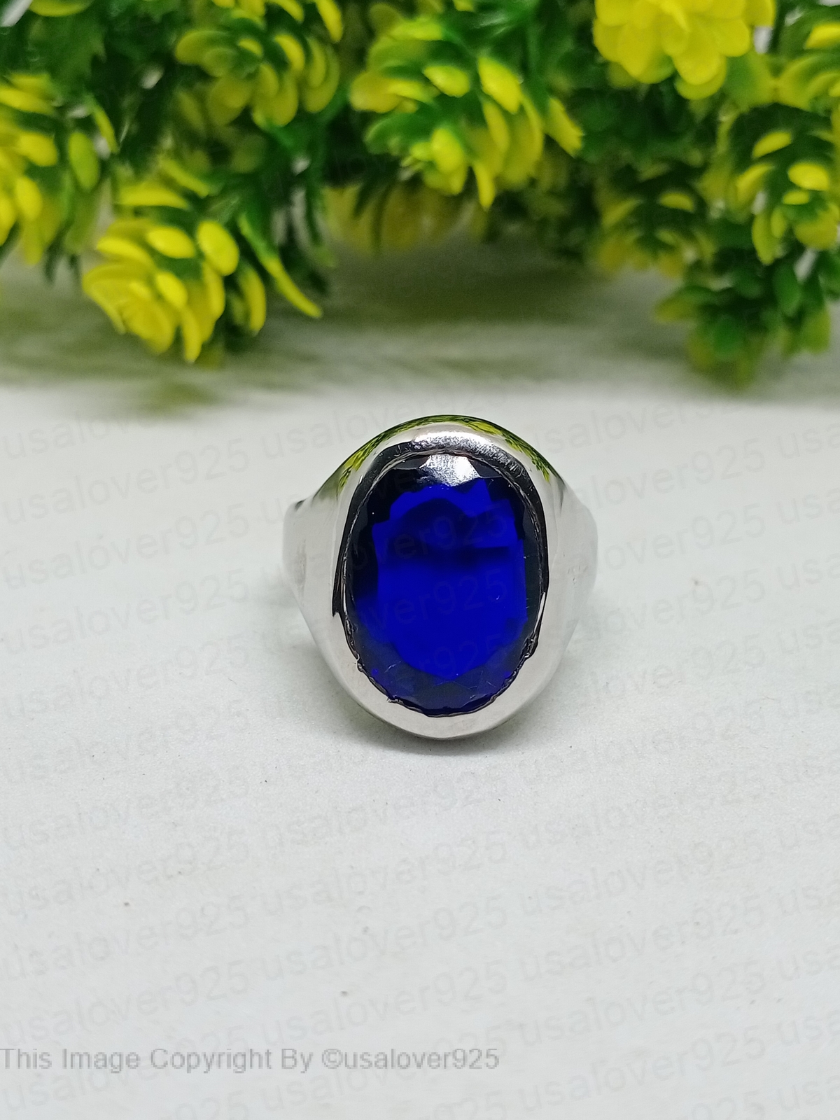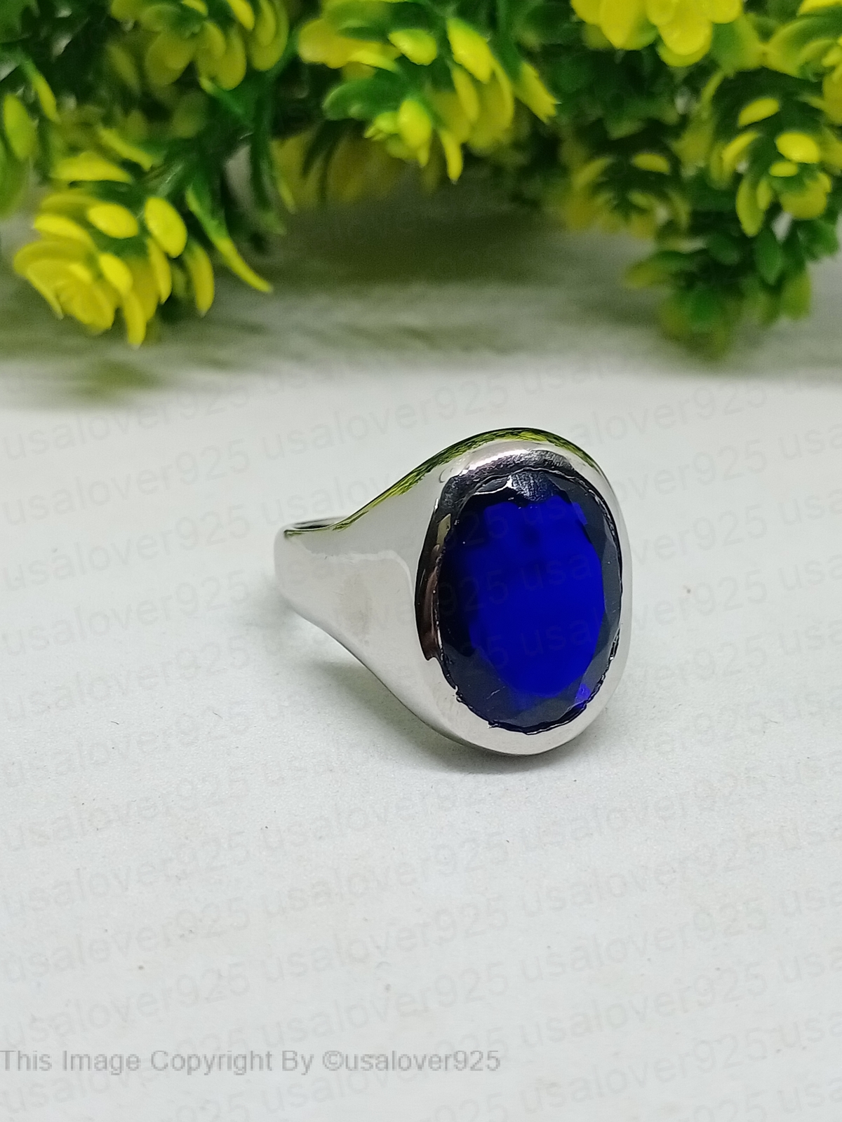 Natural Dark Blue Sapphire Oval Gemstone Sterling Silver Handmade Men Ring