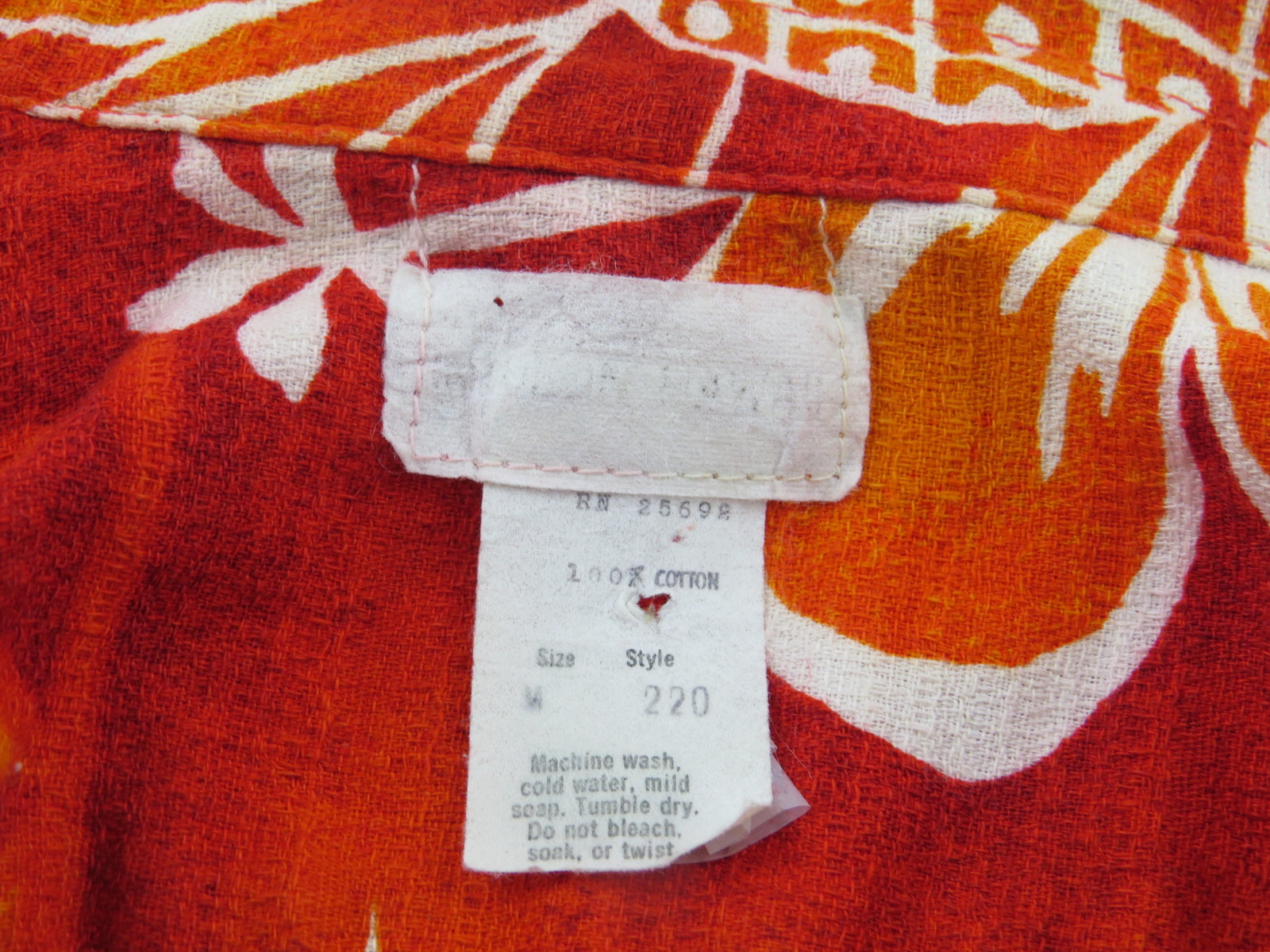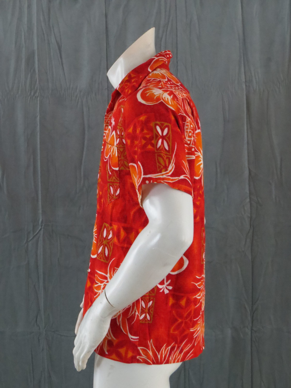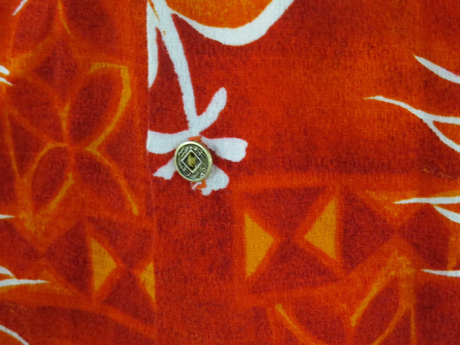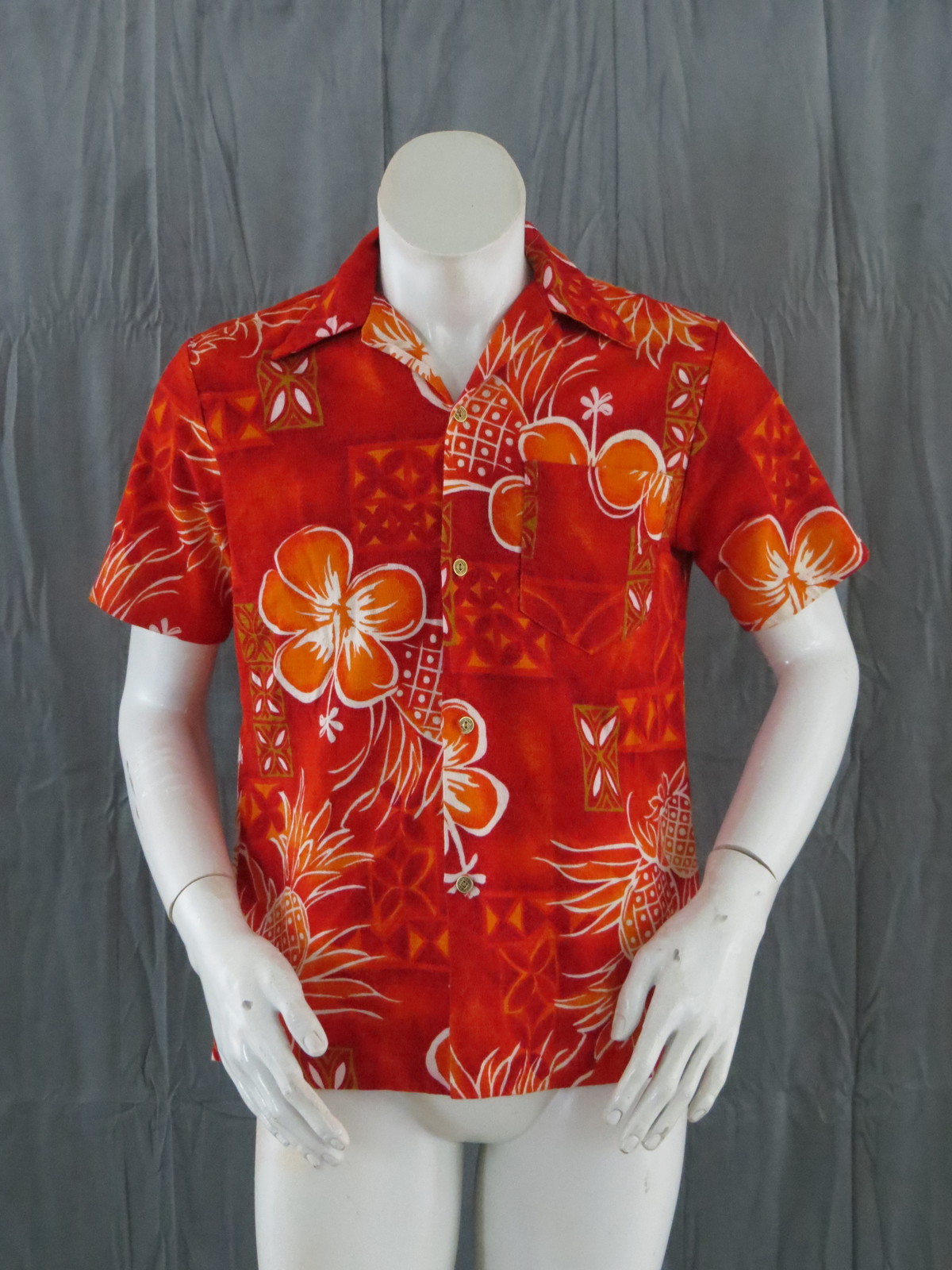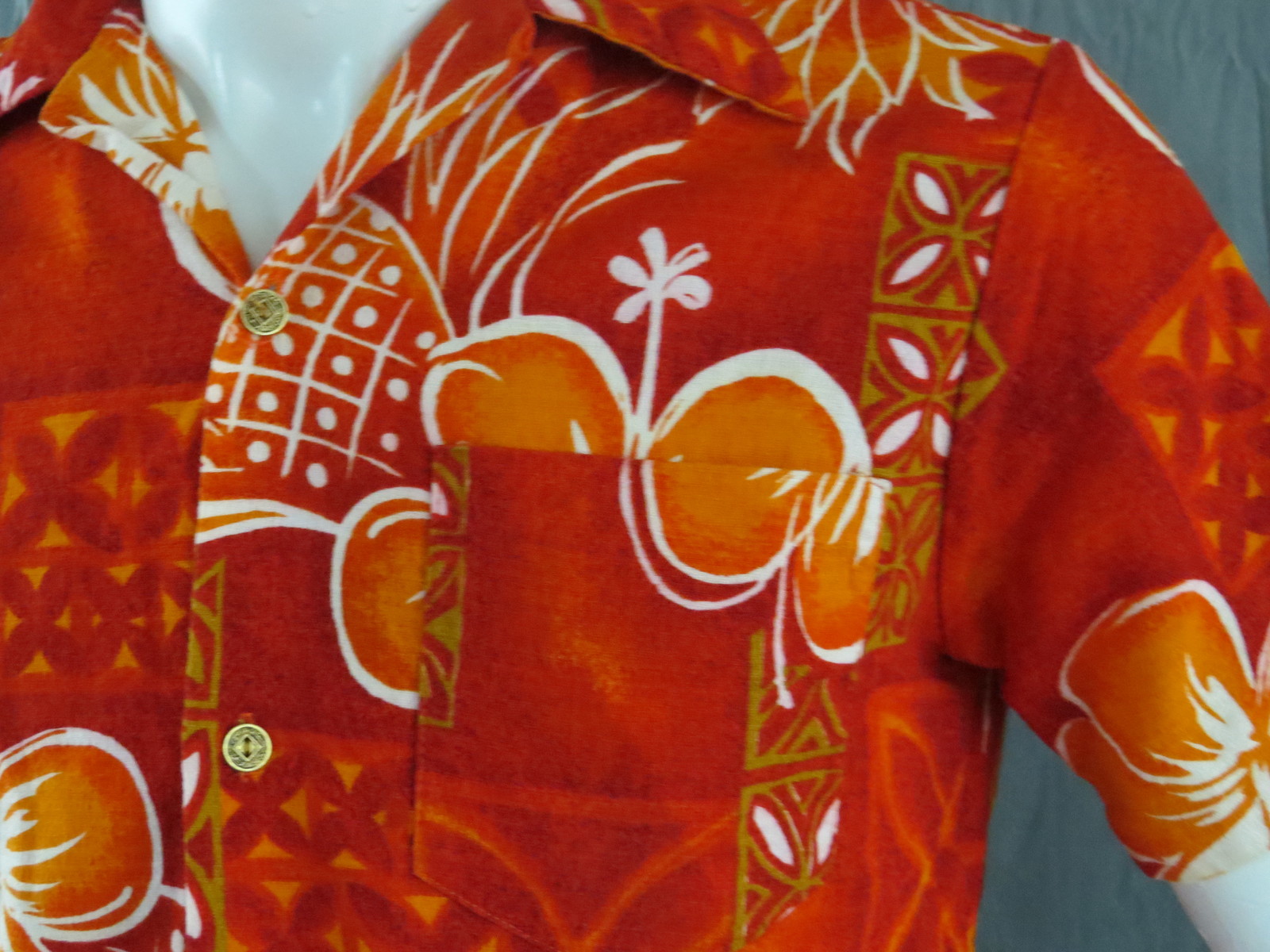 Up for is a vintage bark cloth Hawaiian Aloha shirt. It has an orange base colour. The pattern on the shirt has tribal squares, a large flower and a pineapple. A nice additional touch to the shirt is the metal gold coin-style buttons. What a great vintage shirt do not miss out on it.