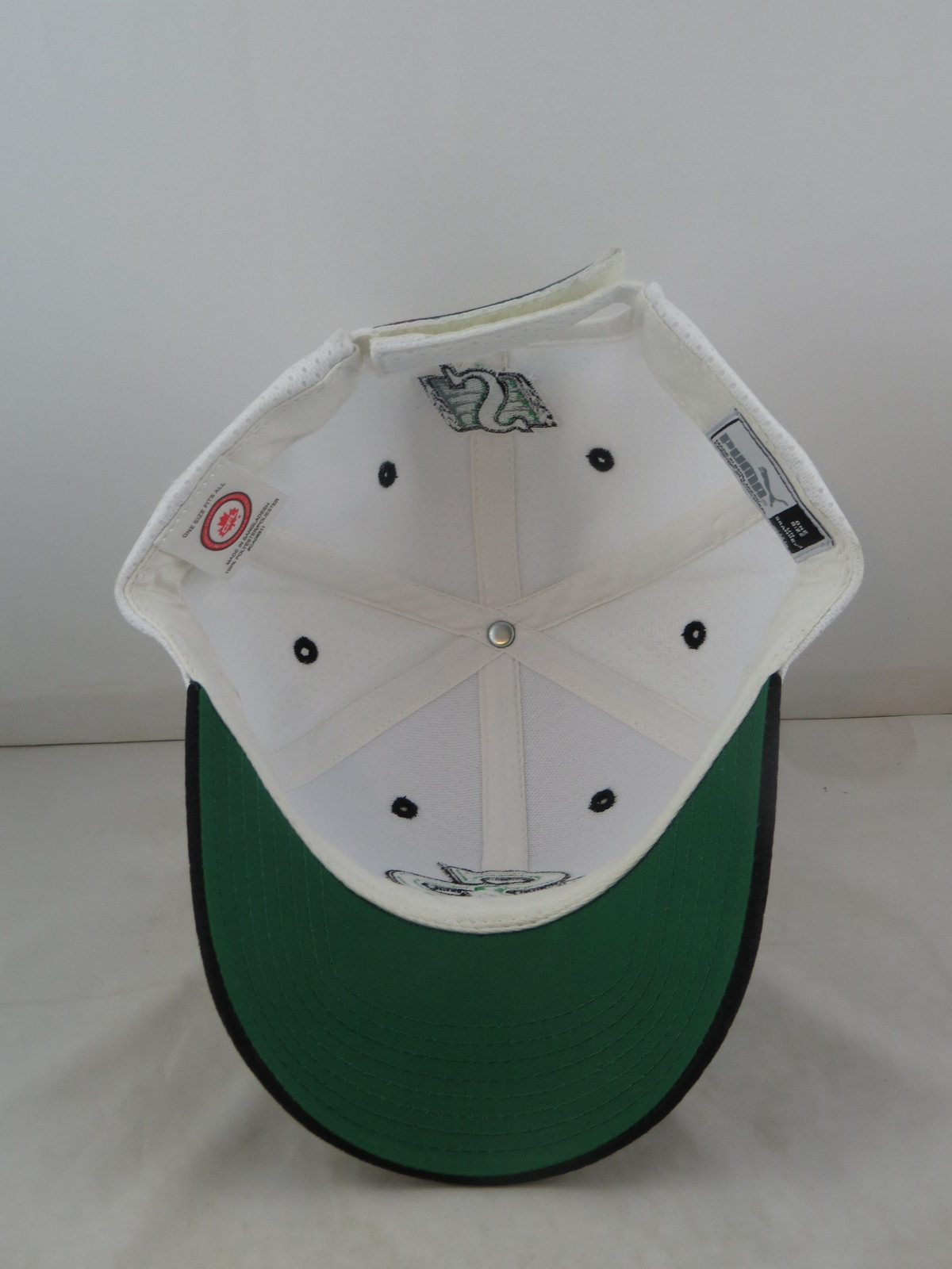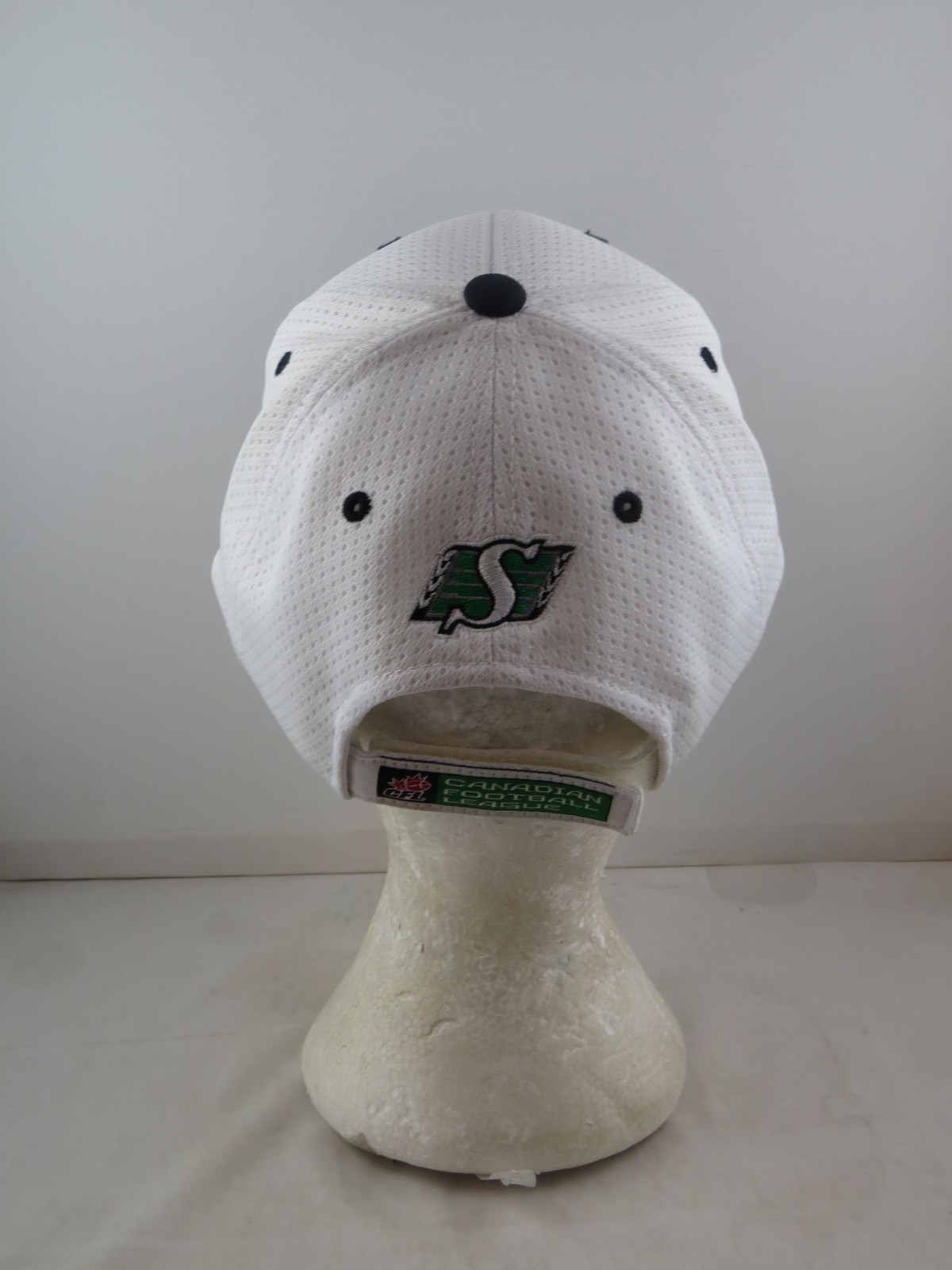 Up for sale is a retro CFL hat by Puma. It is for the Saskatchewan Roughriders and it has a white body with a black brim. The front of the hat has SR stitched into the front of the hat in green. What a great retro hat do not miss out on it.