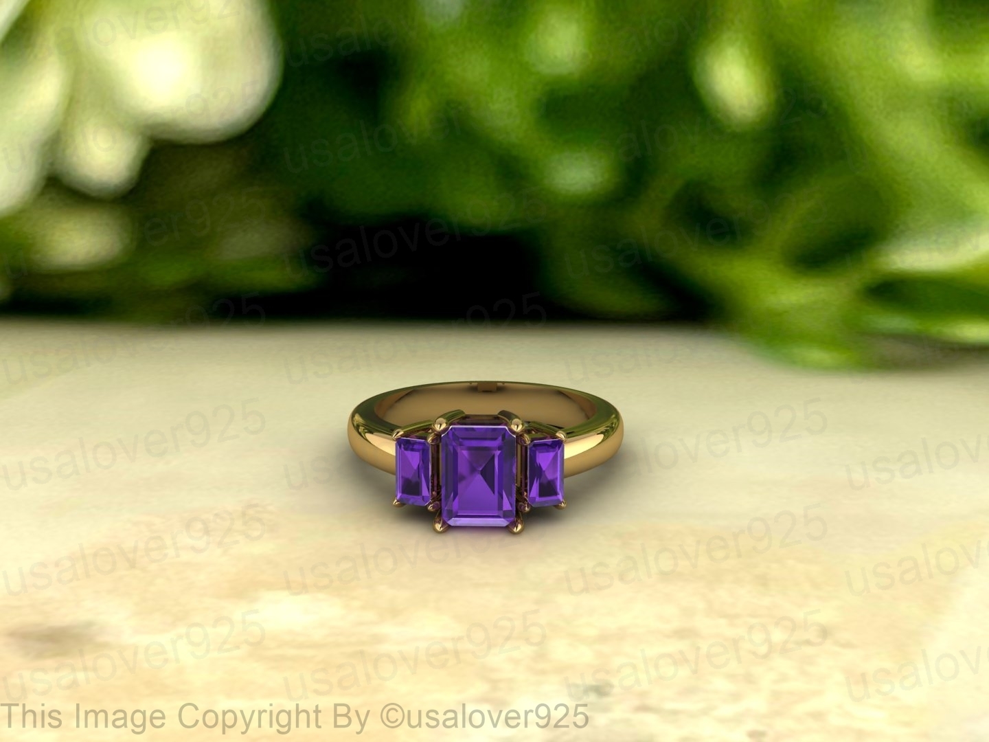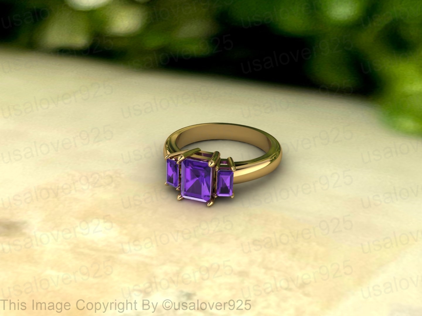 Natural Purple Amethyst Baguette Sterling Silver Three Stone Women Ring Jewelry
