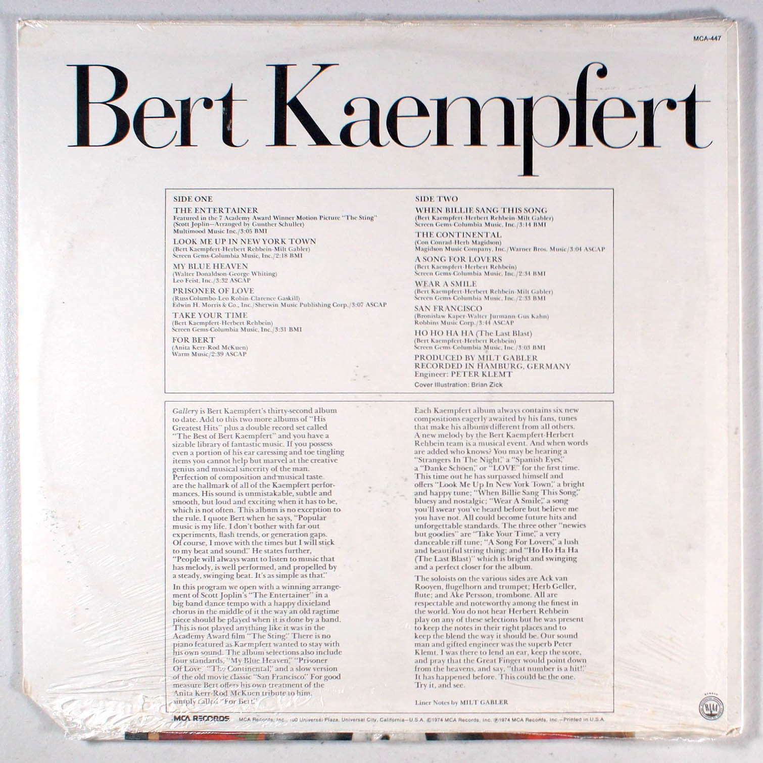 Gallery, by Bert Kaempfert, opens up with a winning arrangement of Scott Joplin's "The Entertainer" in a big band dance tempo with a happy dixieland chorus in the middle of it the way an old ragtime piece should be played when it is done by a band. Each Kaempfert album always contains six new compositions eagerly awaited by his fans, tunes that make his albums different from all others.