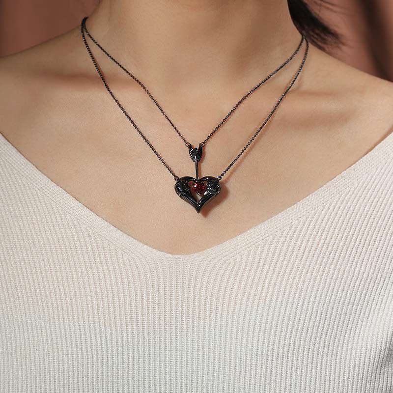 Layered Necklace Black Angel Wing & Heart Cut Garnet Gemstone Engagement Pendent