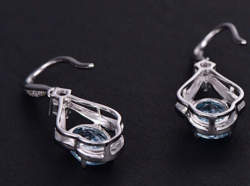 4Ct Corte Ovalado Imitacion Topacio Azul Gota Pendiente 14K Oro Blanco Acabado