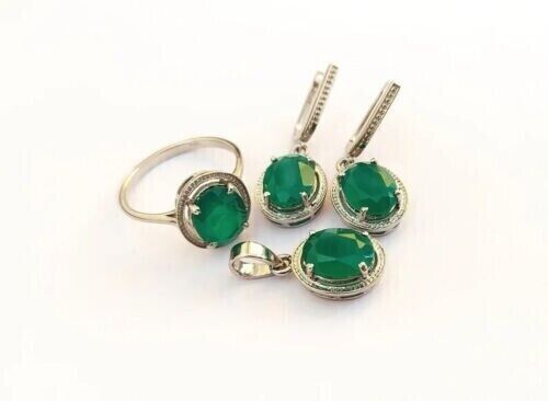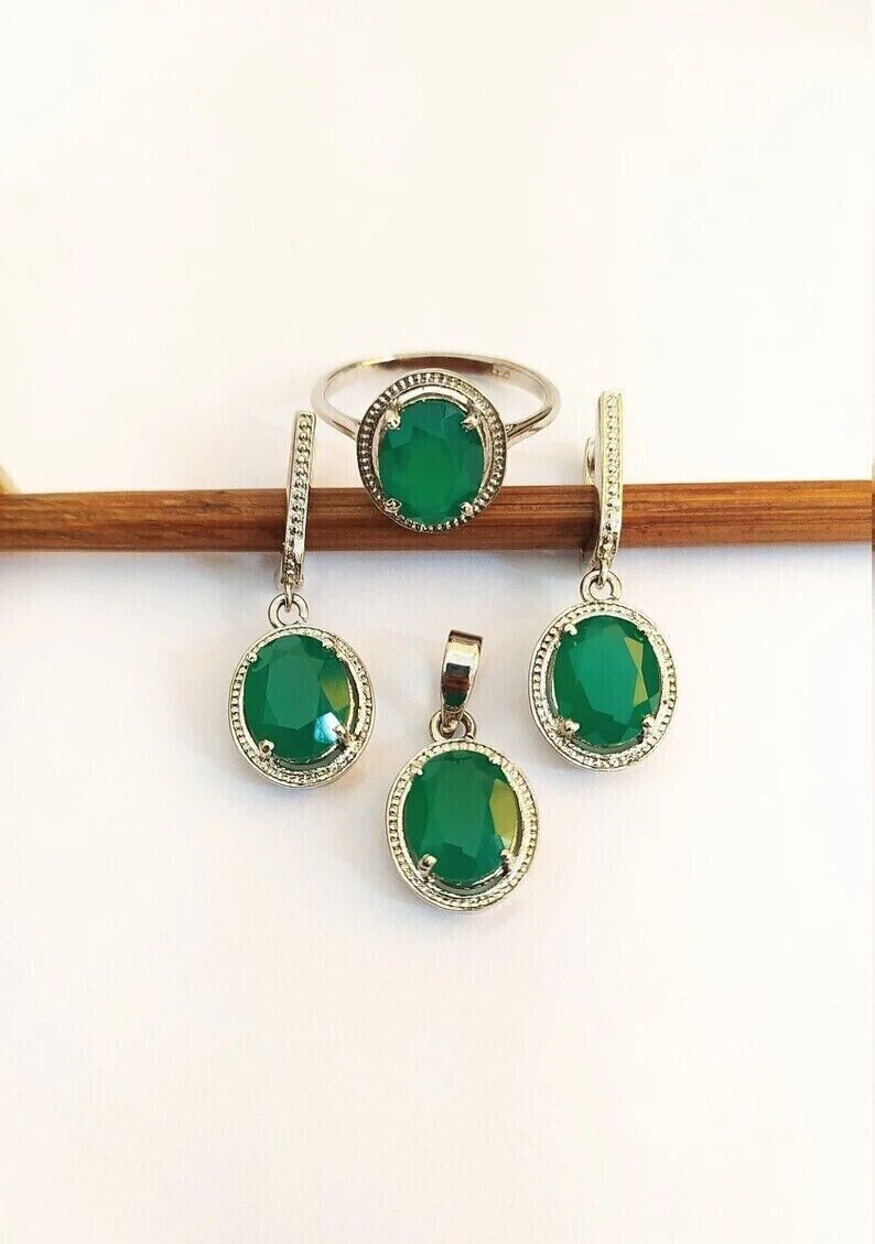 4Ct Ovalado Cz Cortado Esmeralda Halo Colgante/Anillo/Pendiente Set 14K Blanco
