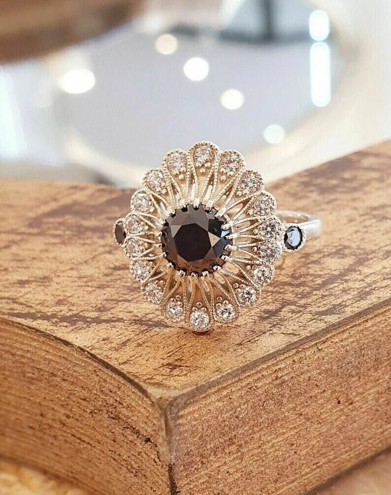 2CT Nero Taglio Rotondo Diamanti Finti Anello Di Fidanzamento IN 14K Oro Bianco