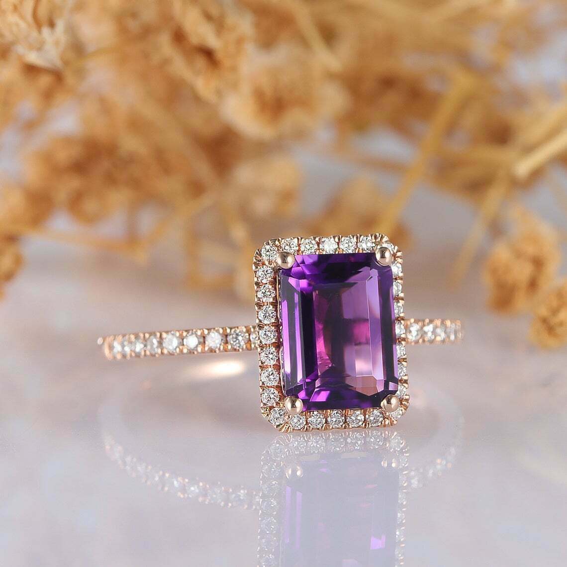4CT Smaragd Schliff Amethyst & Diamant Halo Verlobungsring 14K Rose Gold Finish