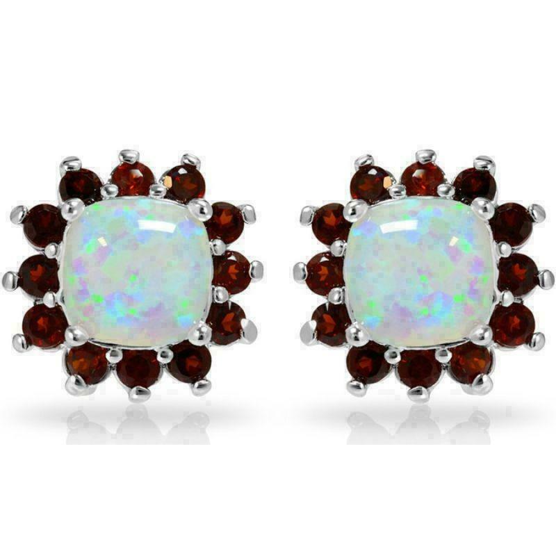 2Ct Taglio Cushion Opale di Fuoco & Halo Granato Orecchini a Lobo 14K Oro Bianco