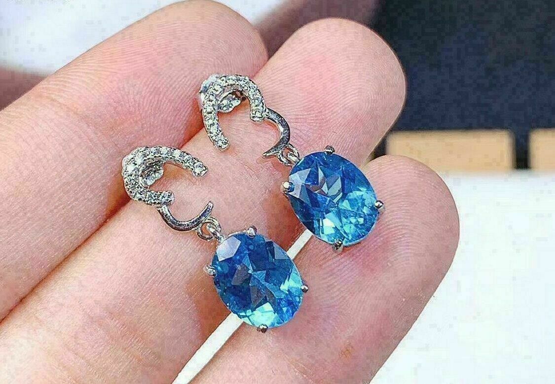 3Ct Ovalado Corte Topacio Azul Gota Y Colgante Mujer Pendientes 14k Oro Blanco