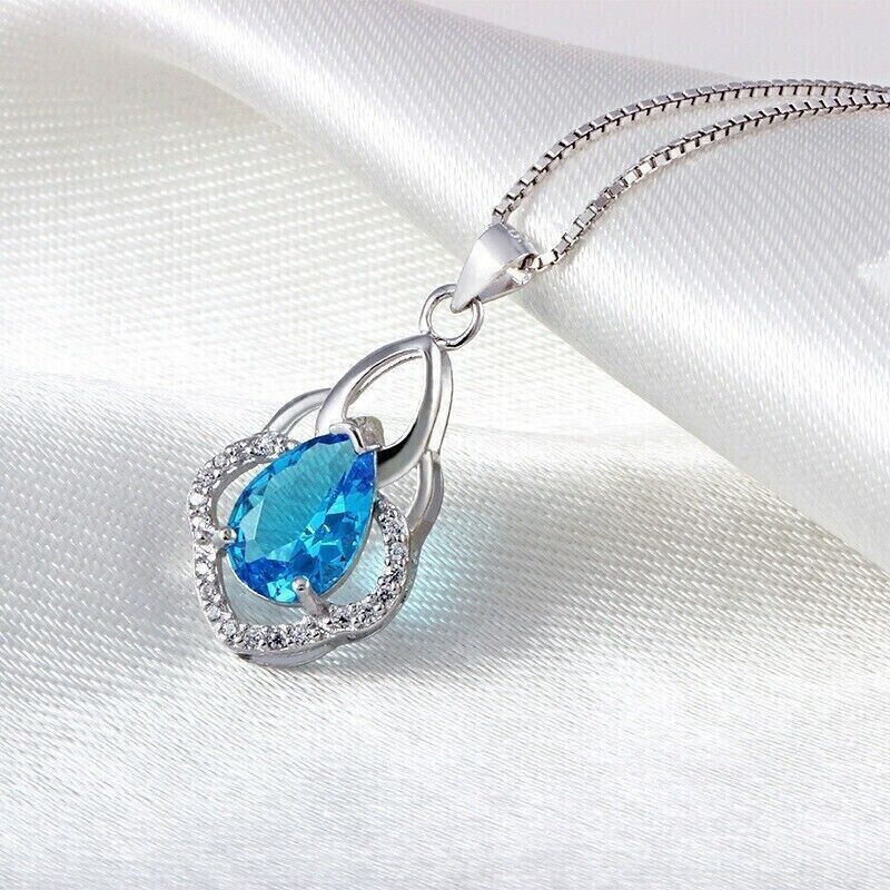 2Ct Corte Pera Cc Topacio Azul Halo Colgante Lágrima 18" Cadena 14k Oro Blanco