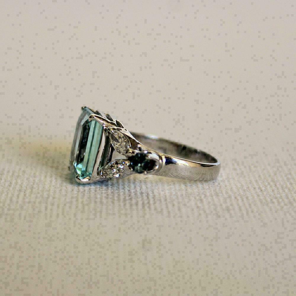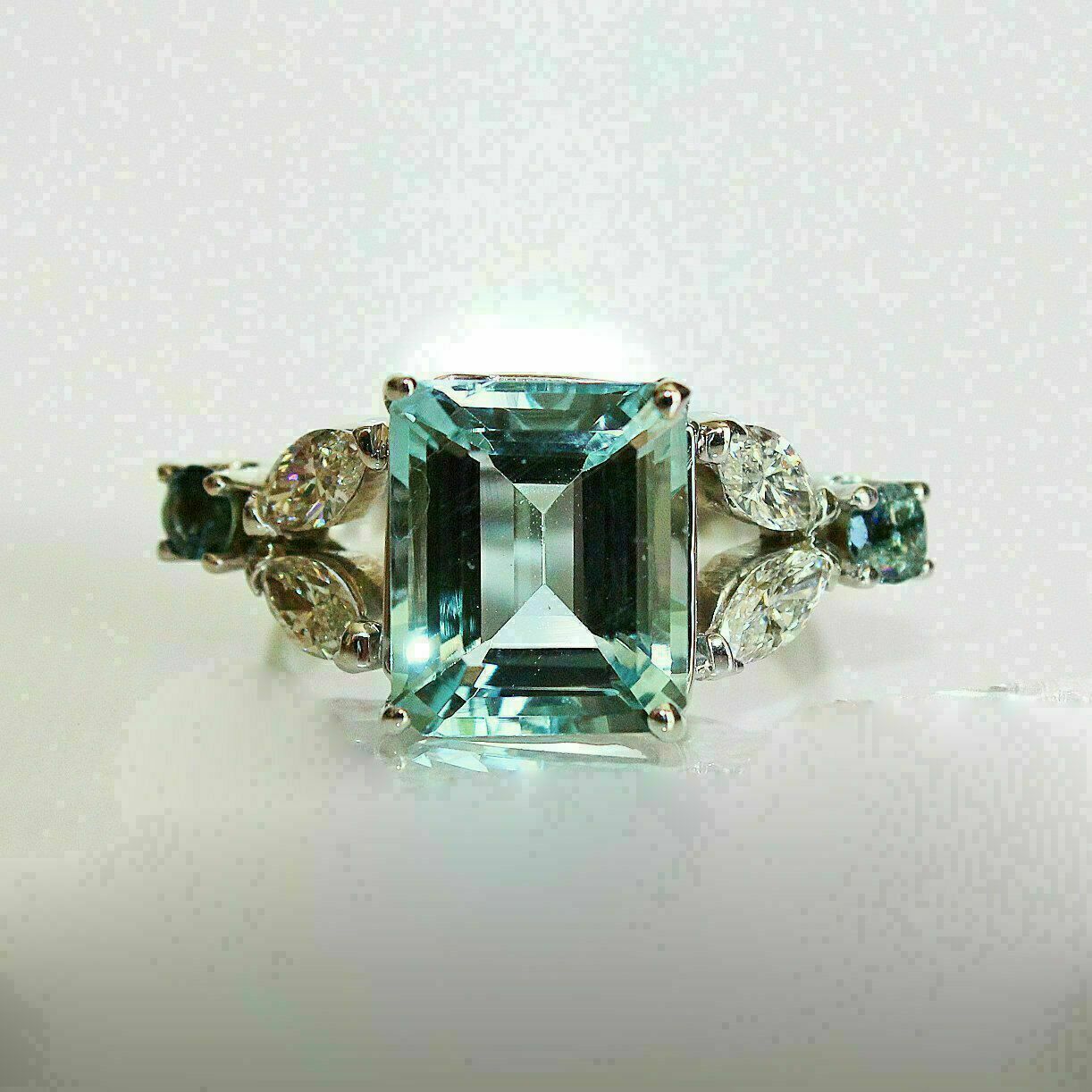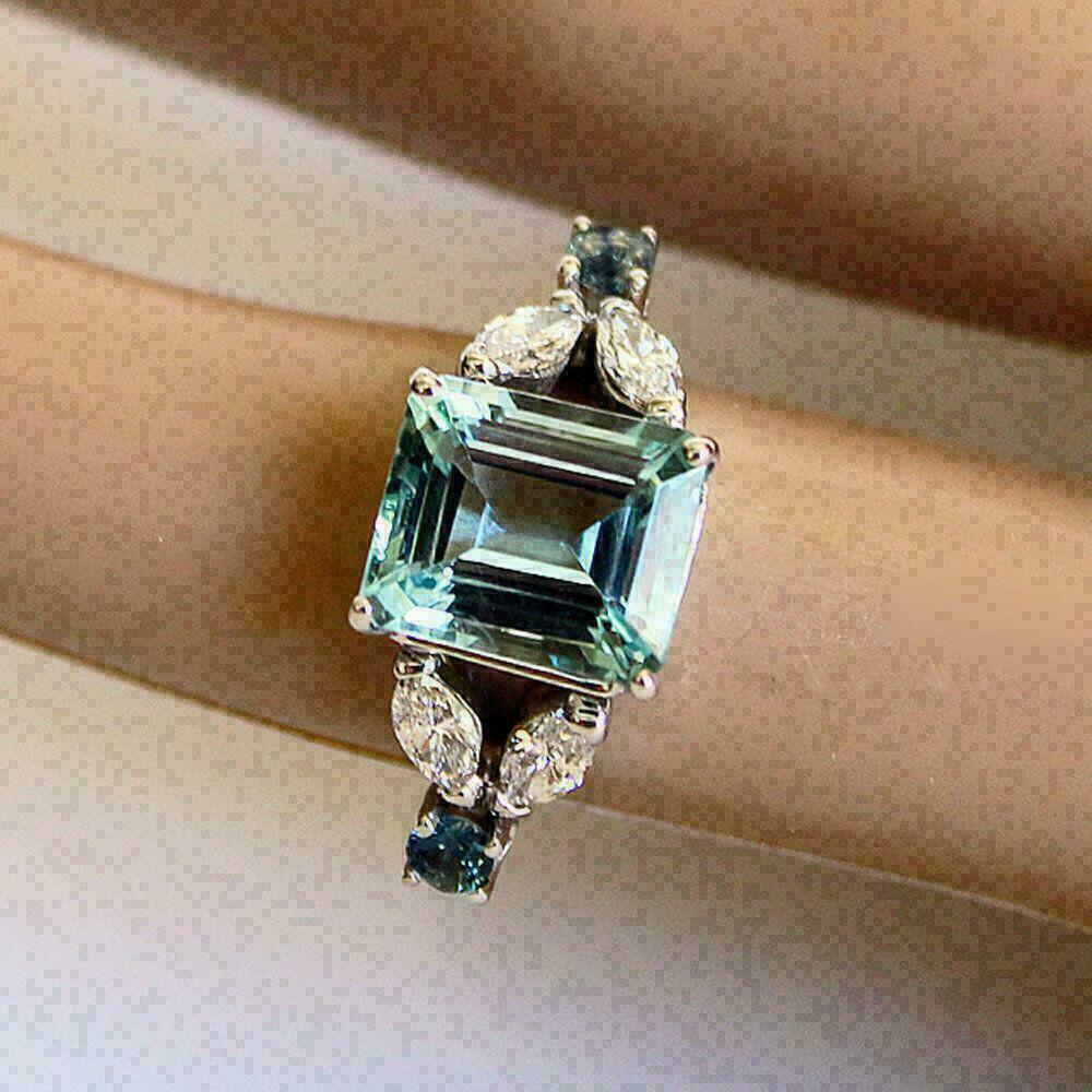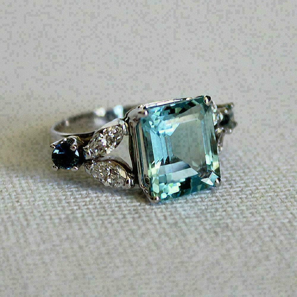 4Ct Émeraude Coupe Bleu Aigue-Marine Art Déco Fiançailles Bague 14k Blanc Or