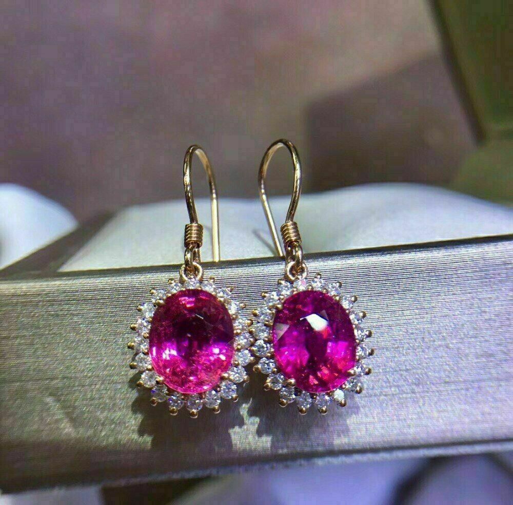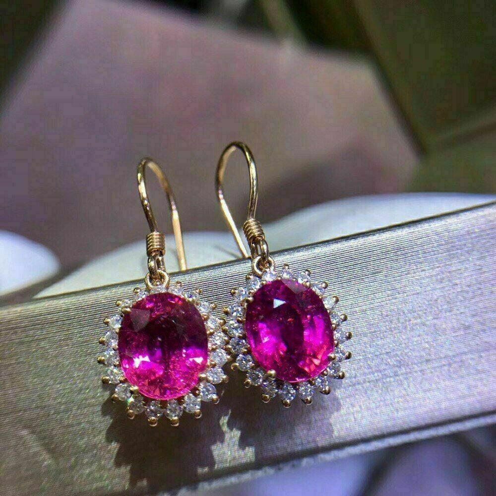 3Ct Corte Ovalado Rosa Diamante Rubí Gota / Pendientes Largos 14K Oro Amarillo