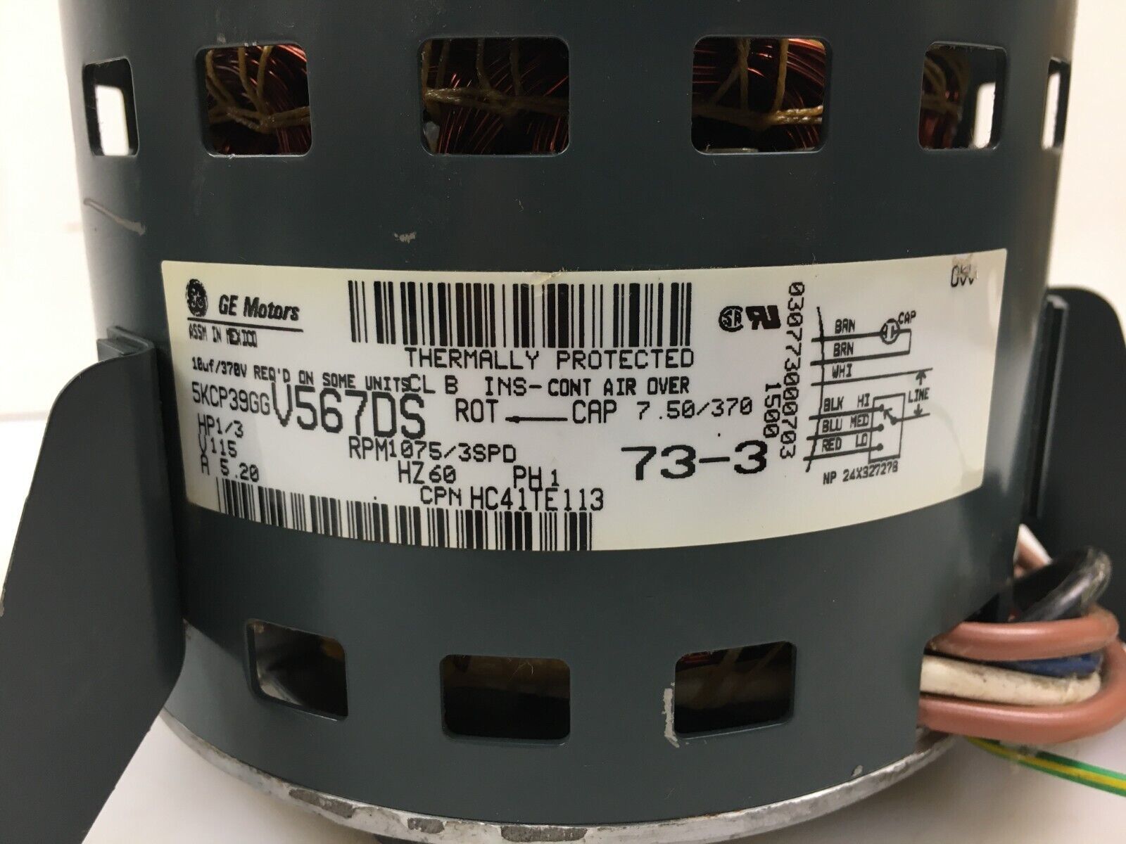 This is GE Motors 5KCP39GGV567DS Blower Motor 1/3HP 1075RPM 3SPD 115V HC41TE113 used part.