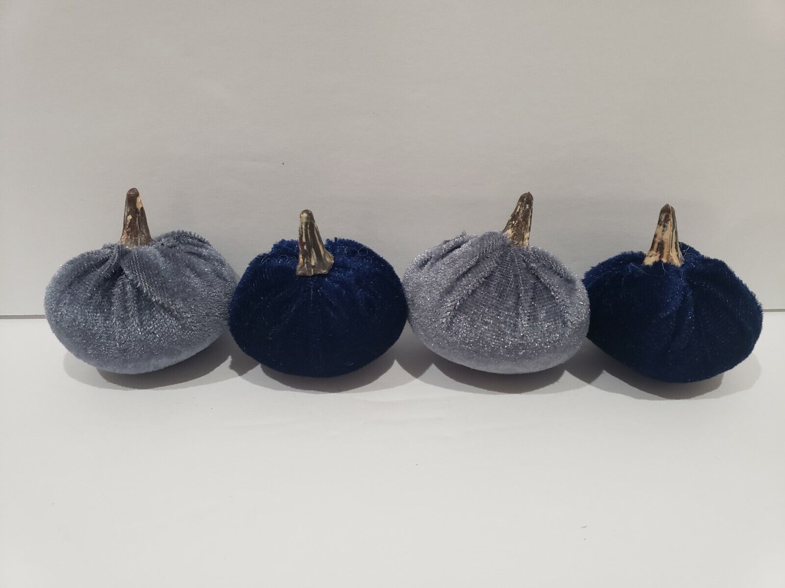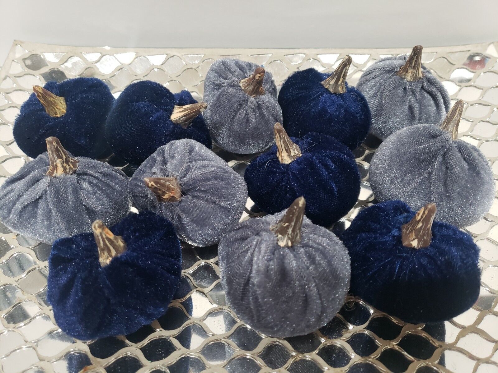 Up for sale we have a set of 12 SMALL (2" x 2") Blue pumpkins Gourds for your Thanksgiving Fall decor. These are made of fabric cotton and covered with velvet material. There are (6) navy blue and (6) Lt Blue color. These will look adorable on a table to a glass cylinder. Each measures approx 2" x 2". Made of cotton and velvety soft material.