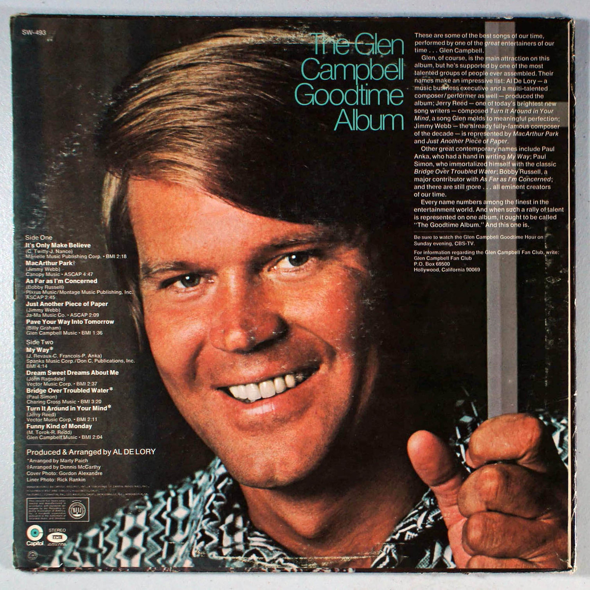 The Glen Campbell Goodtime Album was a spin-off of the TV show of the same name, this album is a nice representation of what Campbell was about at the time. The album spent 30 weeks on the Country Albums Chart, peaking at no. 2 and also reached no. 20 on the main Billboard Albums Chart in 1970. The album's first single, It's Only Make Believe, became an International hit reaching no. 3 on the US Country Charts, no. 10 on the Billboard Hot 100, and Top 5 in several other countries around the world.
