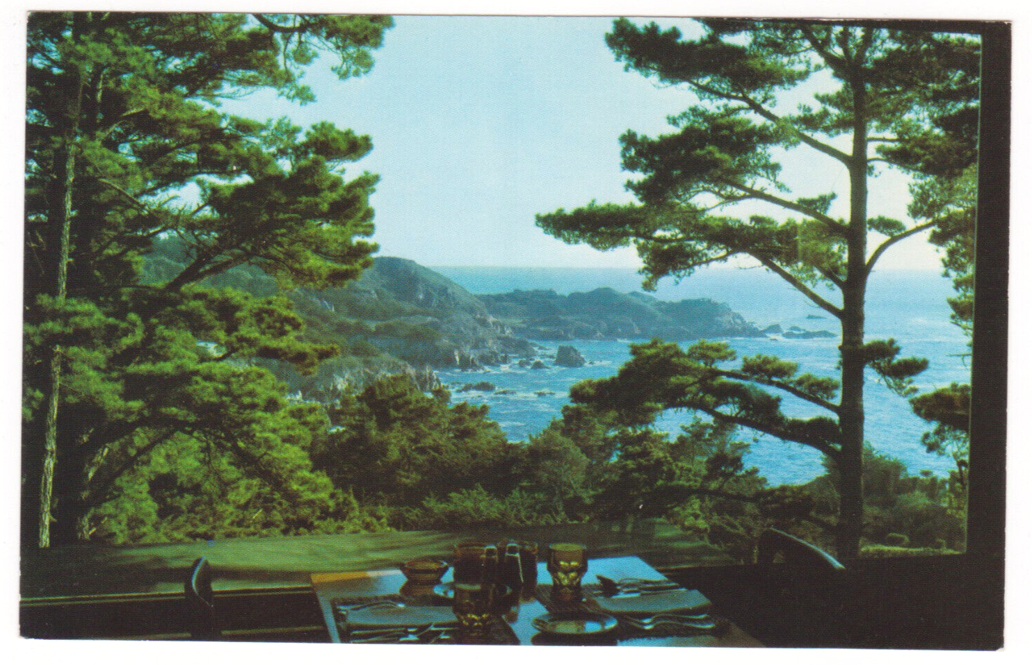 Vtg Postcard-Highlands Inn-Carmel CA-Dining Room View-Trees-Ocean-Chrome-CA5