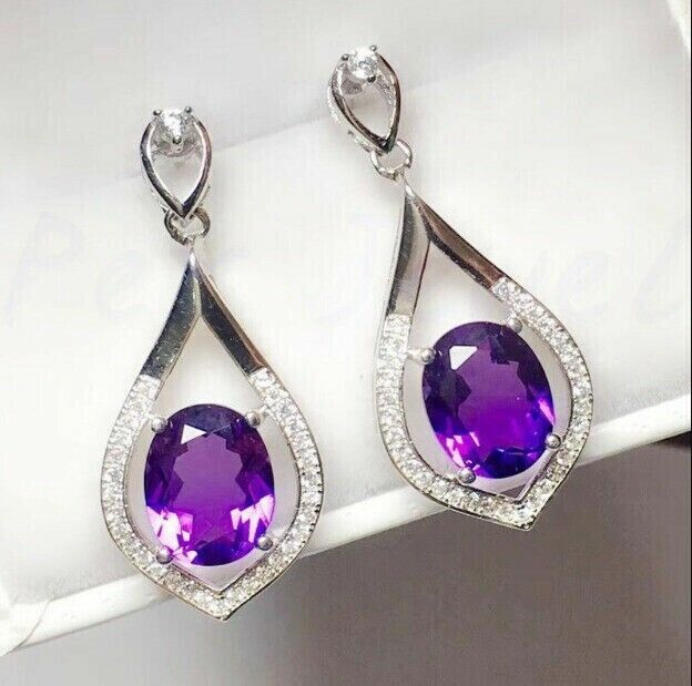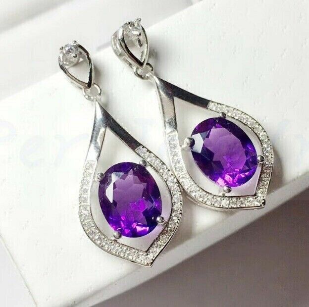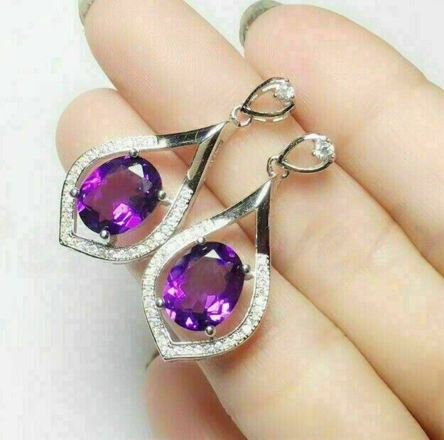 3CT Oval Cut CZ Amethyst Drop & Dangle Earrings 14k White Gold Plated 925 Silver