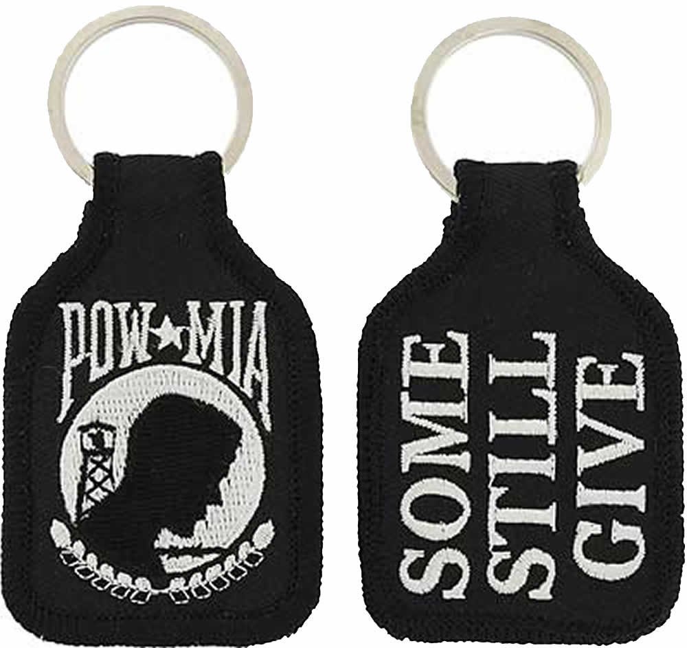 POW MIA SOME STILL GIVE KEY CHAIN - Black/White - Veteran Owned Business. 2.5" WIDE BY 3.5" LONG . Embroidery on both sides! Great Gift for ANYONE! HatnPatch Is THE Veteran Owned and Operated Family Business - 2 Generations of Retired Marines - We Ship Your Order Within 24 Hours And Usually The SAME DAY!